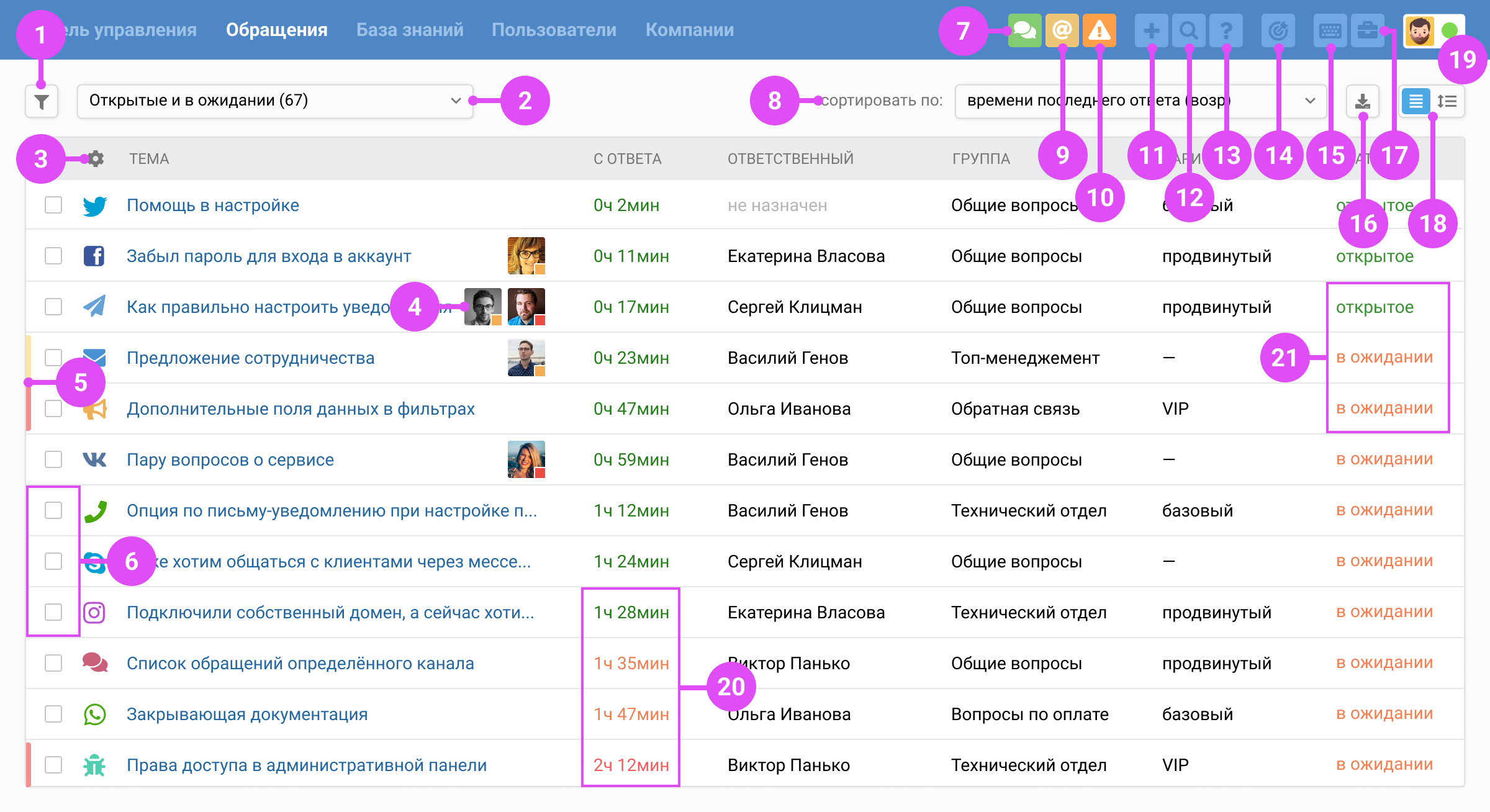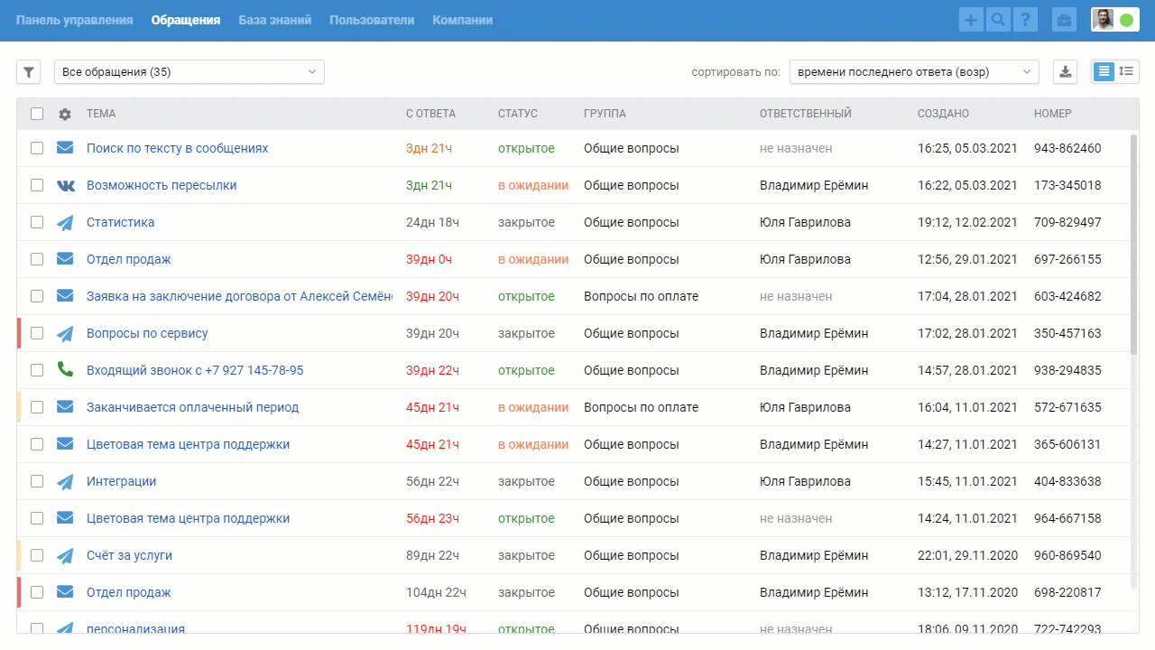 21. Статус обращения помогает быстро понять, какие обращения требуют ответа сотрудника. Основное внимание — открытым обращениям.