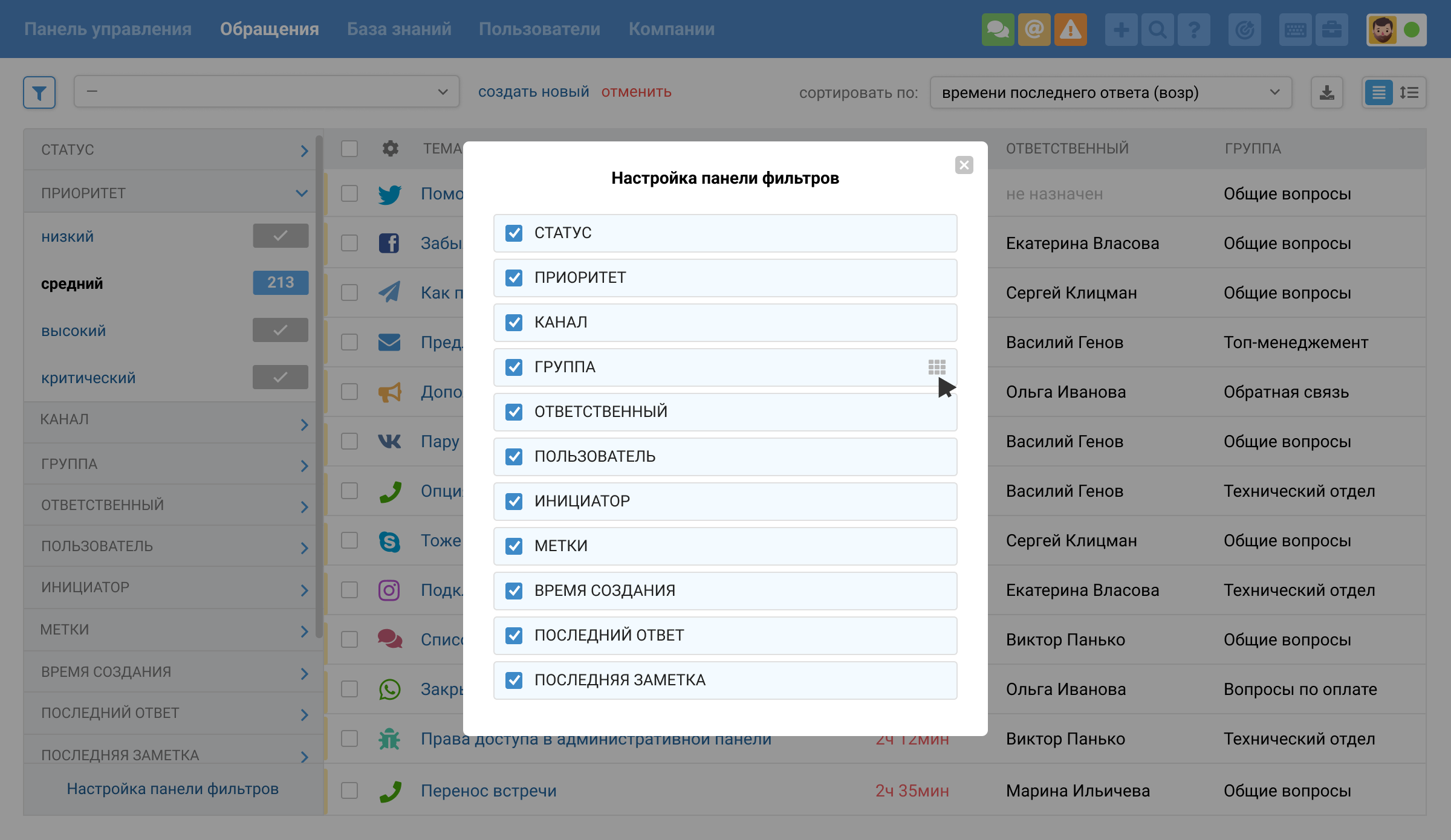 а. Нажмите на иконку шестеренки и выберите те данные, которые вам нужны на странице списка обращений. Меняйте порядок колонок простым перетаскиванием.