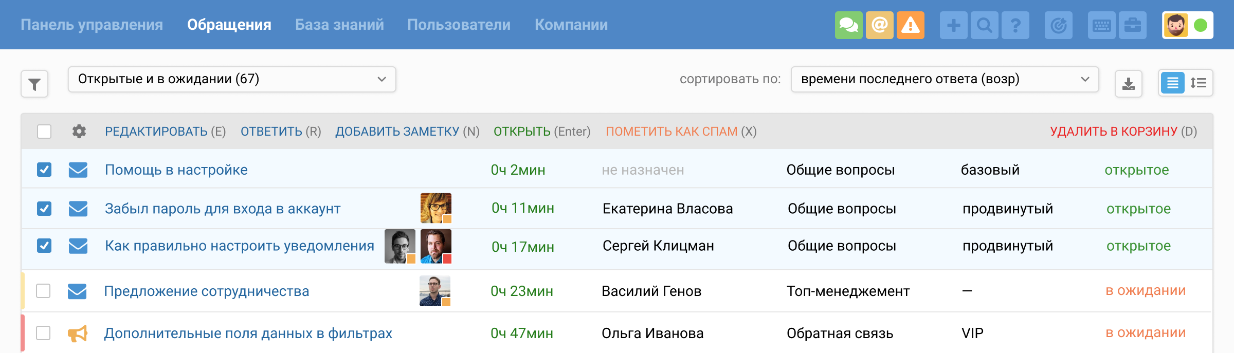 в. Через массовое редактирование можно ответить сразу нескольким пользователям, добавить одинаковую заметку, изменить статус или приоритет, добавить или убрать метки. Также можно пометить все выбранные обращения как спам или удалить их в корзину. Подробнее про массовые действия в списке обращений.