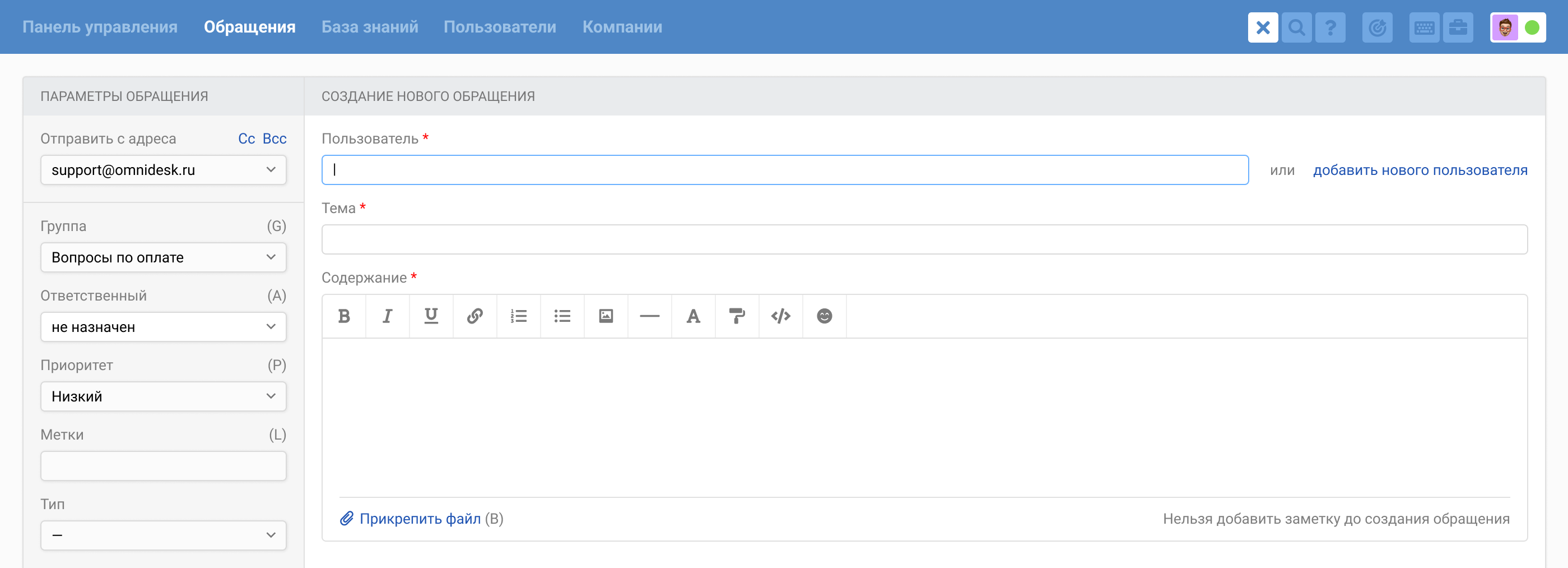 в. Омнидеск запоминает последние значения, которые сотрудник выставляет в полях «Отправить с адреса» и «Группа» при создании обращения вручную, и подставляет их при следующем создании обращения сотрудником.