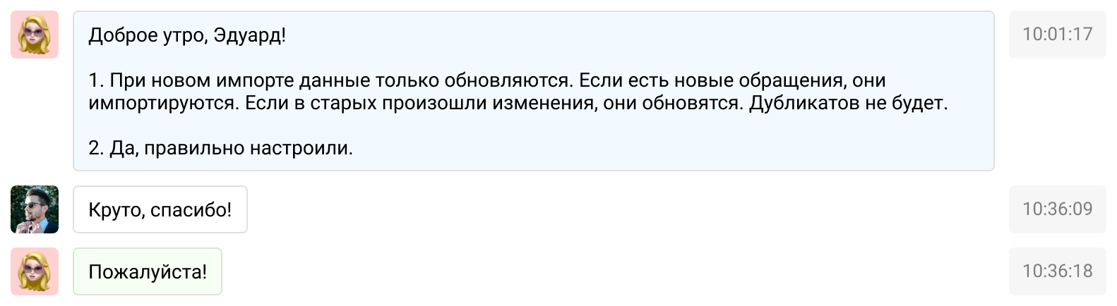 Если всё-таки происходит ситуация, когда сотрудники практически одновременно отвечают, отправляется только первый ответ, а остальные — блокируются.