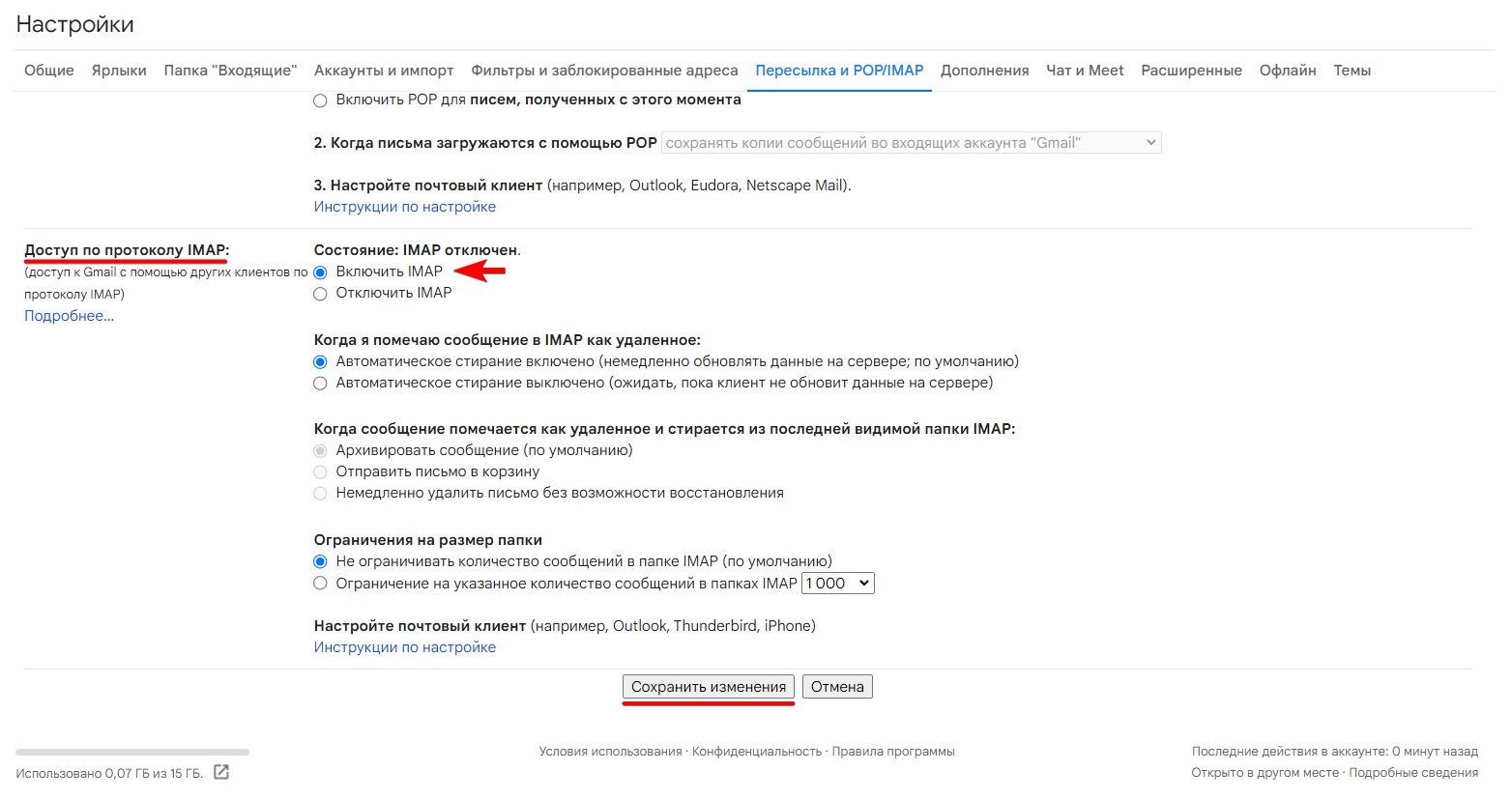1. Чтобы Gmail позволил считывать письма через IMAP, в интерфейсе Gmail перейдите по пути Настройки (шестеренка) → опция «Все настройки» → подраздел «Пересылка и POP/IMAP» → в блоке «Доступ по протоколу IMAP» отметьте чекбокс «Включить IMAP»: