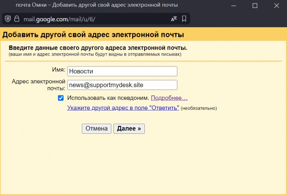 в. Подтвердить добавление адреса группы рассылки в качестве псевдонима вы сможете как в аккаунте сотрудника на Омнидеске, так и в одном из ящиков, которые включены в группу рассылки.