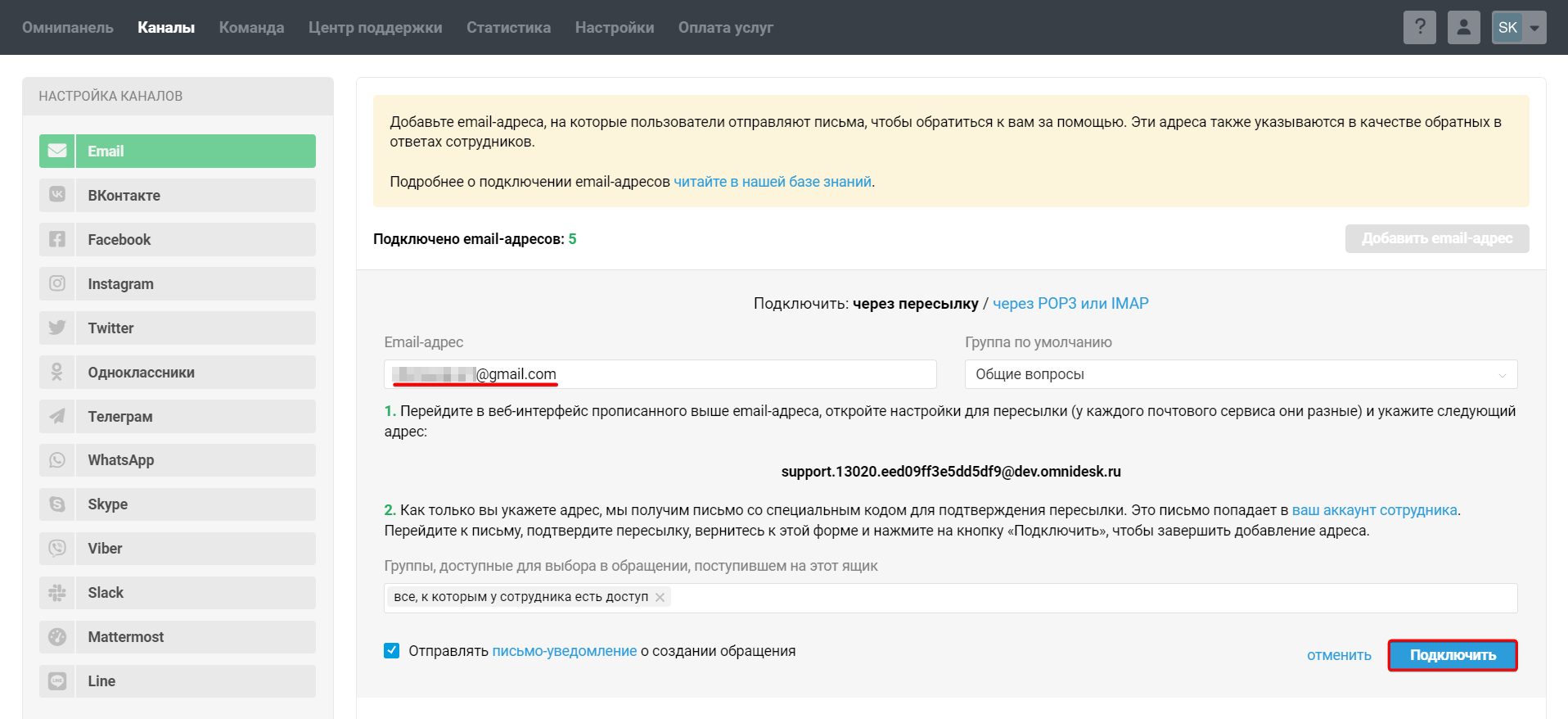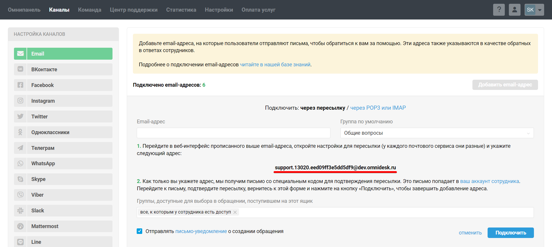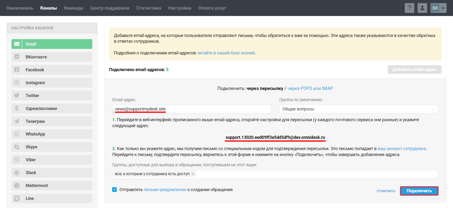 г. Вернитесь в аккаунт администратора, укажите в поле «Email-адрес» ваш ящик, выберите группу, в которую по умолчанию будут попадать поступающие на email обращения, и нажмите на кнопку «Подключить».