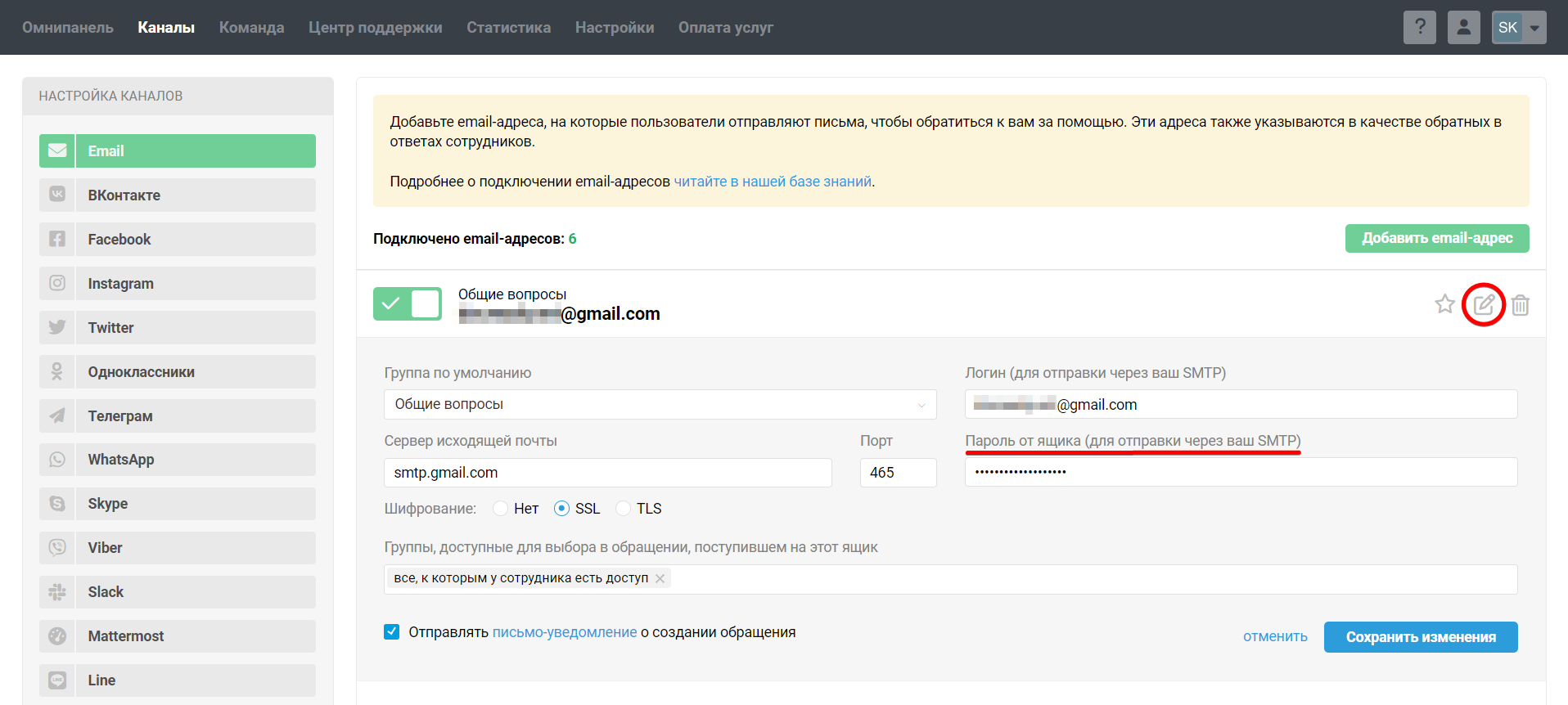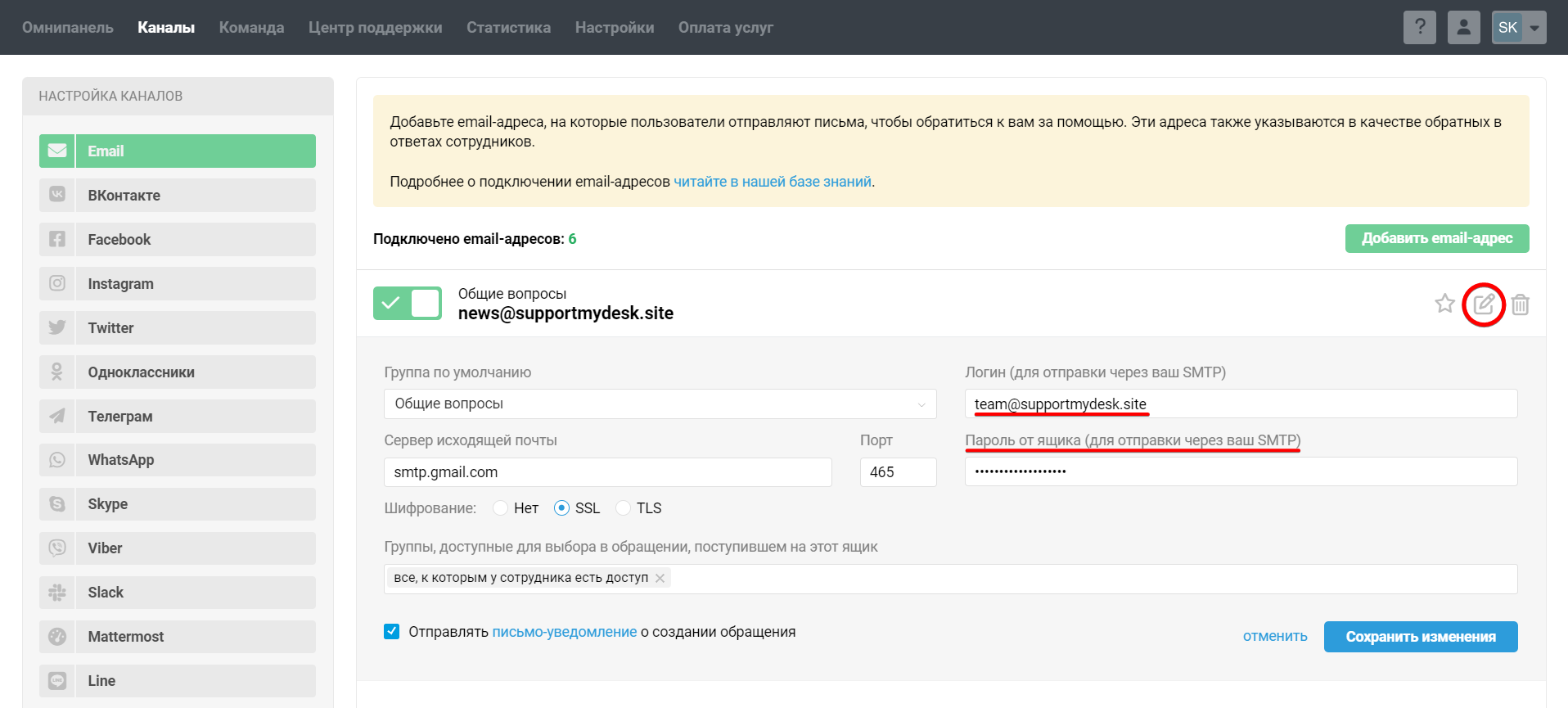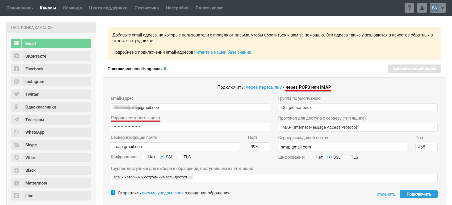 г. Вернитесь в аккаунт администратора, укажите в поле «Email-адрес» ваш ящик, выберите группу, в которую по умолчанию будут попадать поступающие на email обращения, и нажмите на кнопку «Подключить».