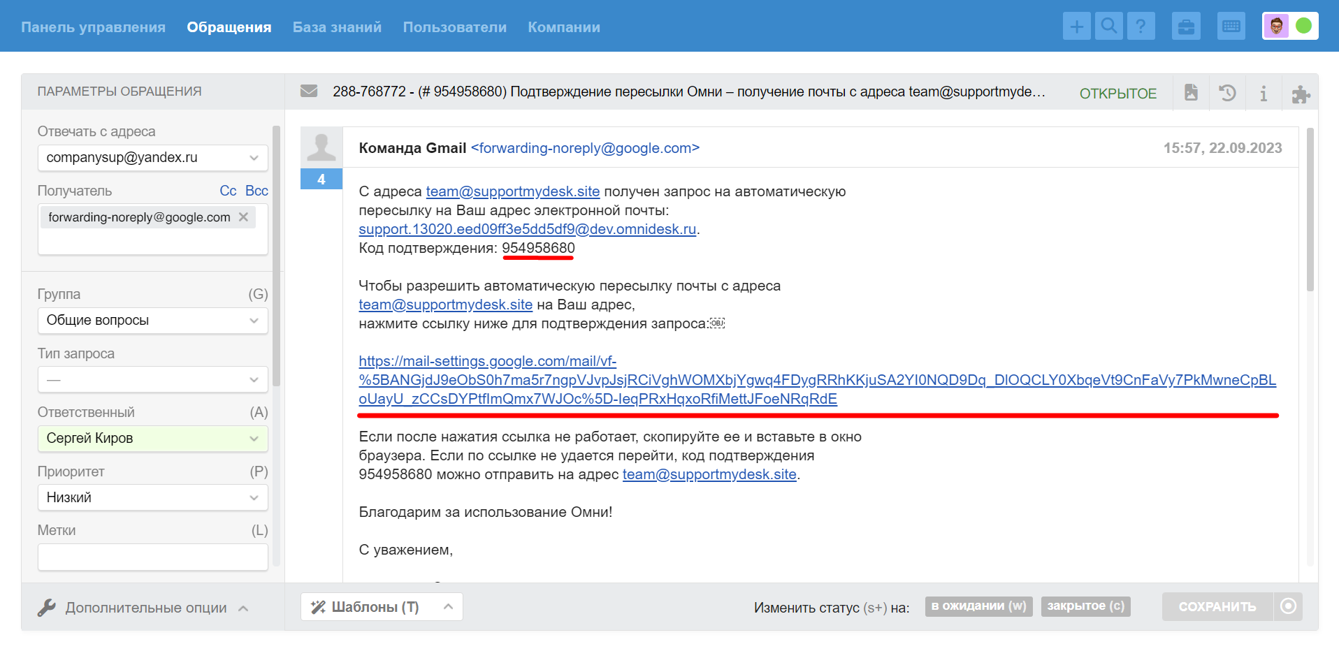 в. Перейдите в аккаунт сотрудника в Омнидеске, найдите письмо от [email protected] и подтвердите пересылку, пройдя по ссылке.