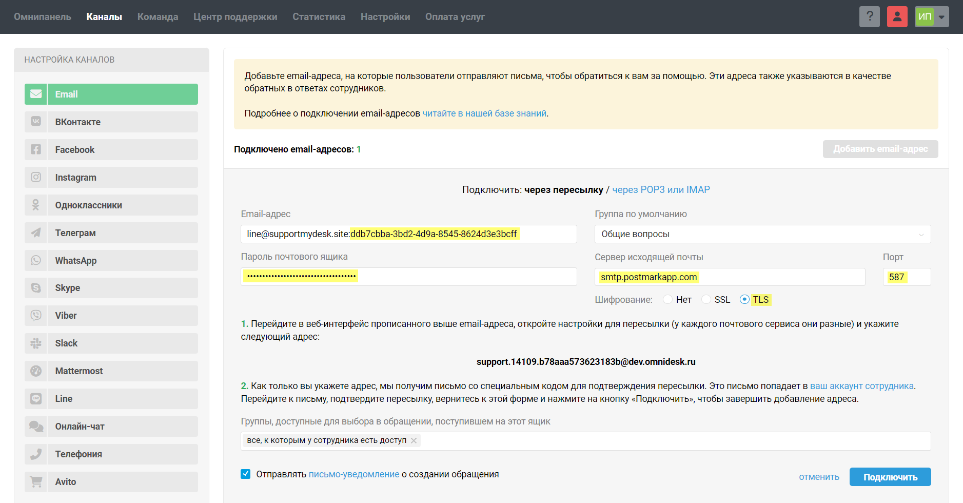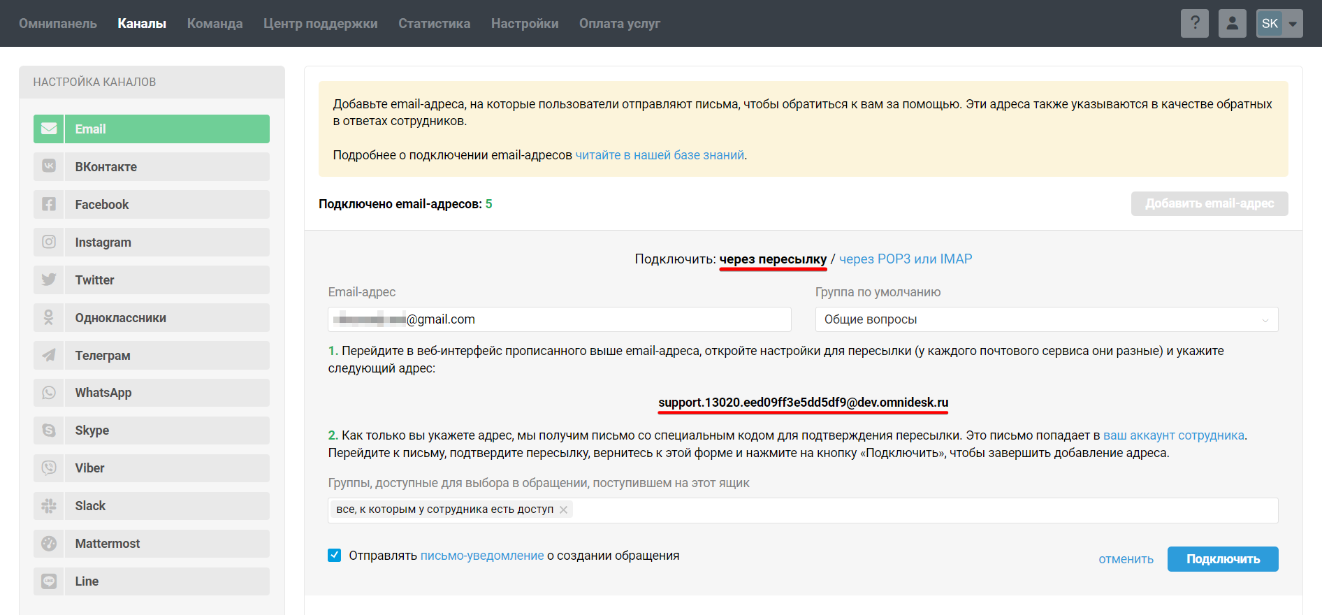 1. Перейдите в аккаунт администратора в Омнидеске → Каналы → подраздел Email, нажмите «добавить email-адрес» → выберите «Собственный» → в опции «Подключить» выберите «через пересылку».