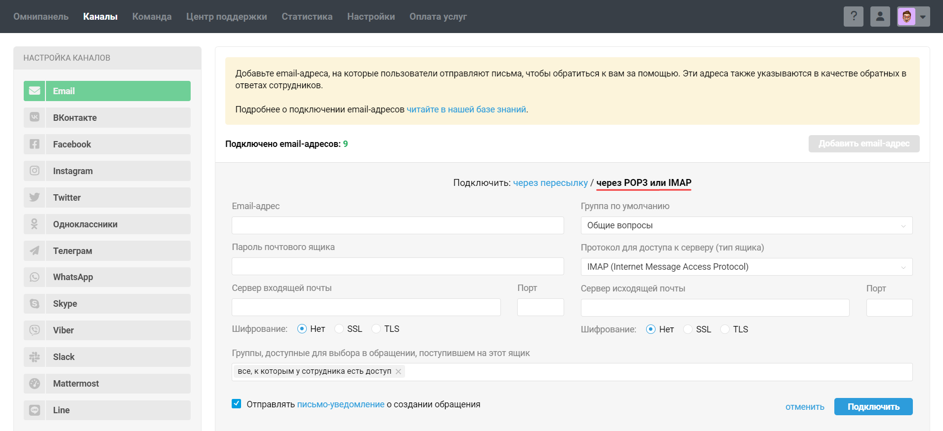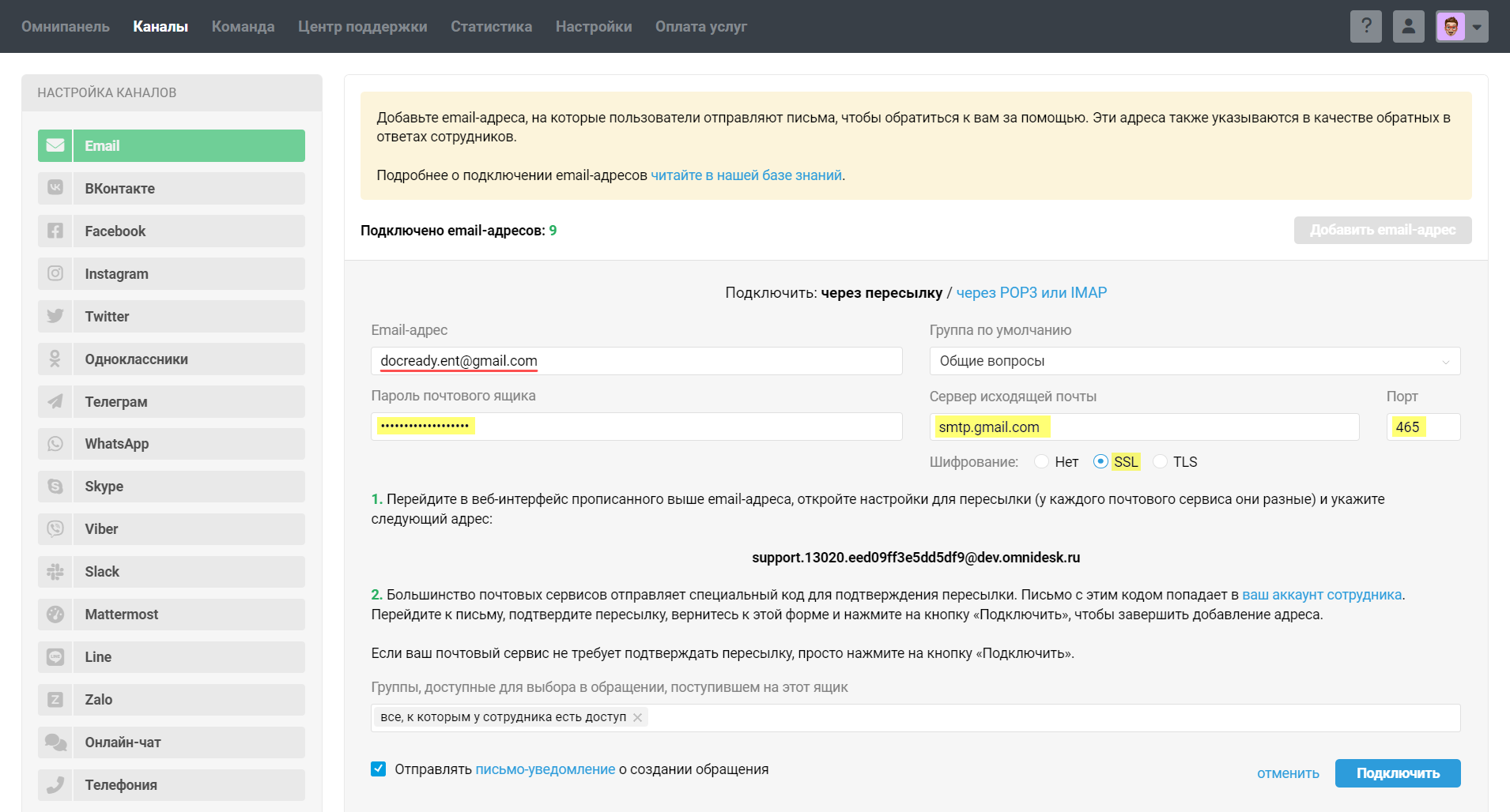 Шаг 2: настройте подключение ящика в Омнидеске.