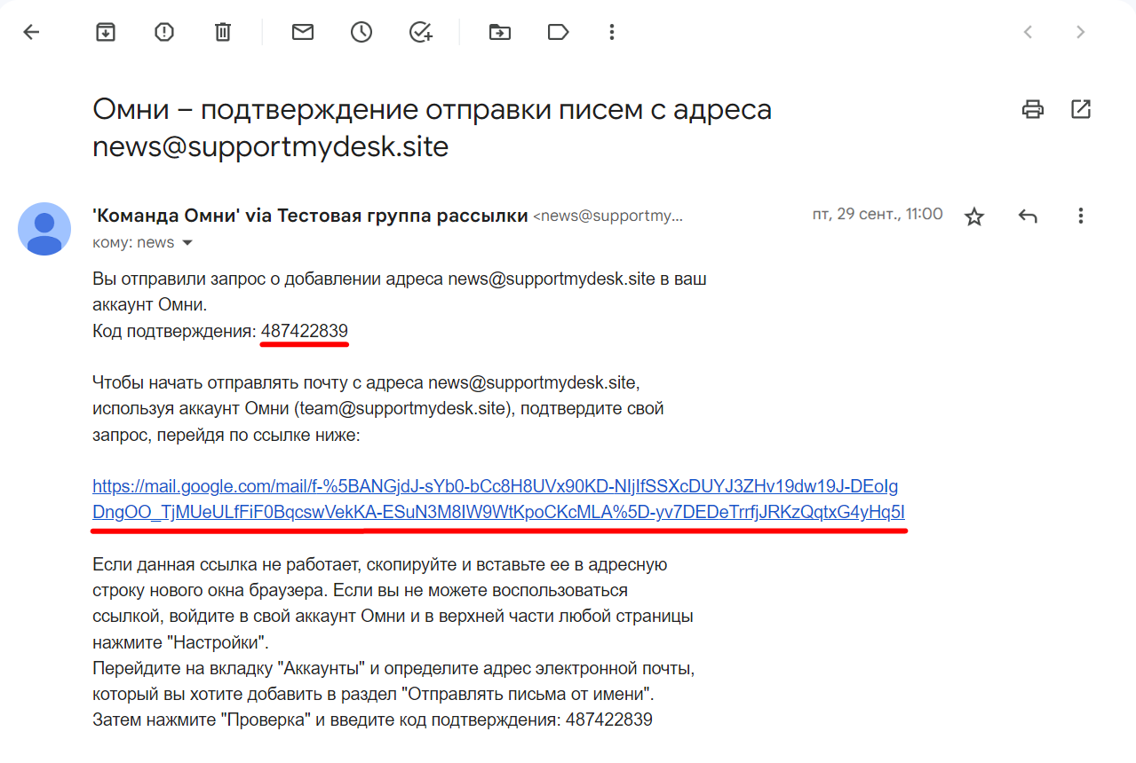 в. Подтвердить добавление адреса группы рассылки в качестве псевдонима вы сможете как в аккаунте сотрудника на Омнидеске, так и в одном из ящиков, которые включены в группу рассылки.