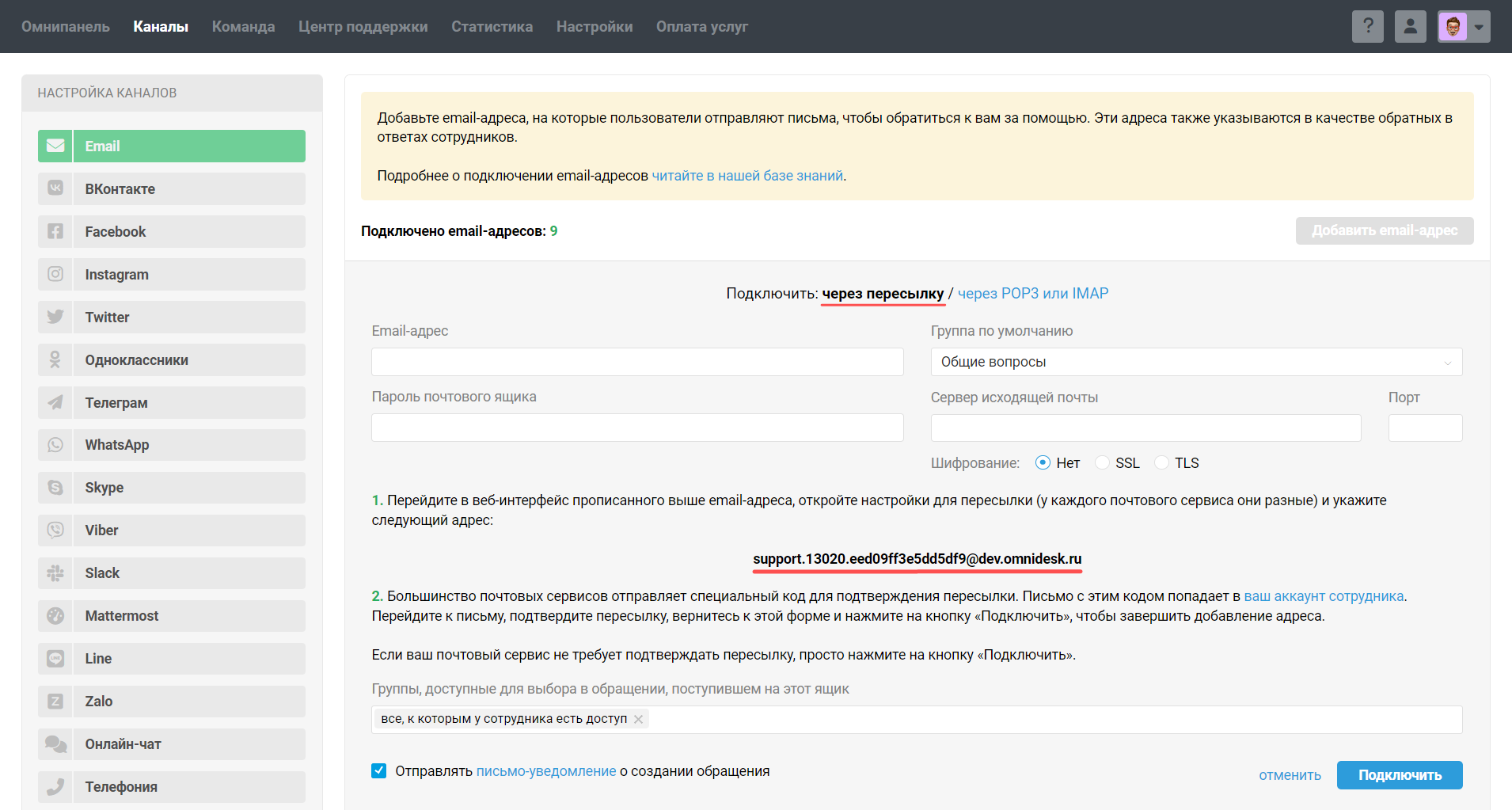а. Перейдите в аккаунт администратора в Омнидеске → Каналы → подраздел Email, нажмите «добавить email-адрес» → в опции «Подключить» выберите «через пересылку». Скопируйте указанный системный адрес для пересылки.