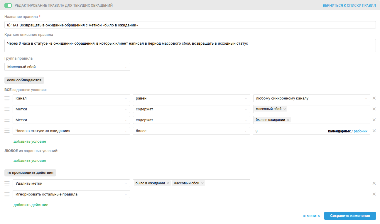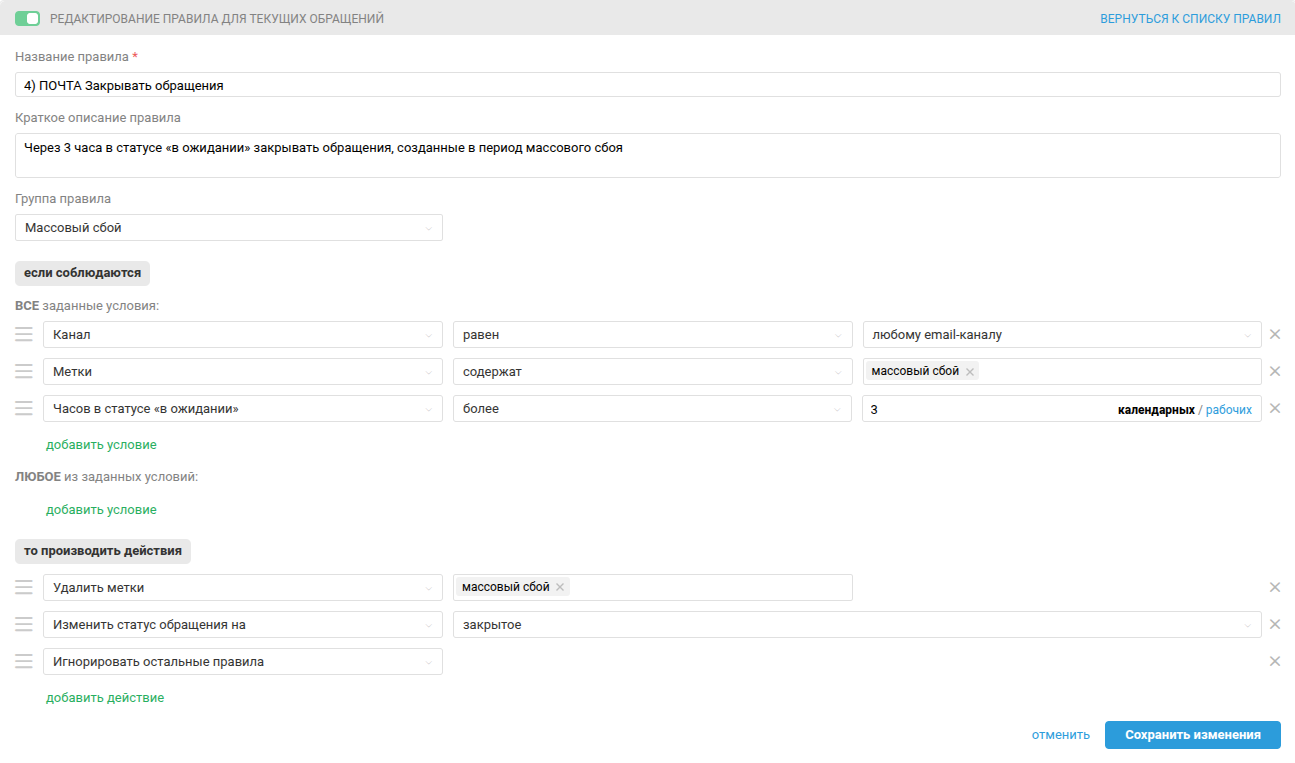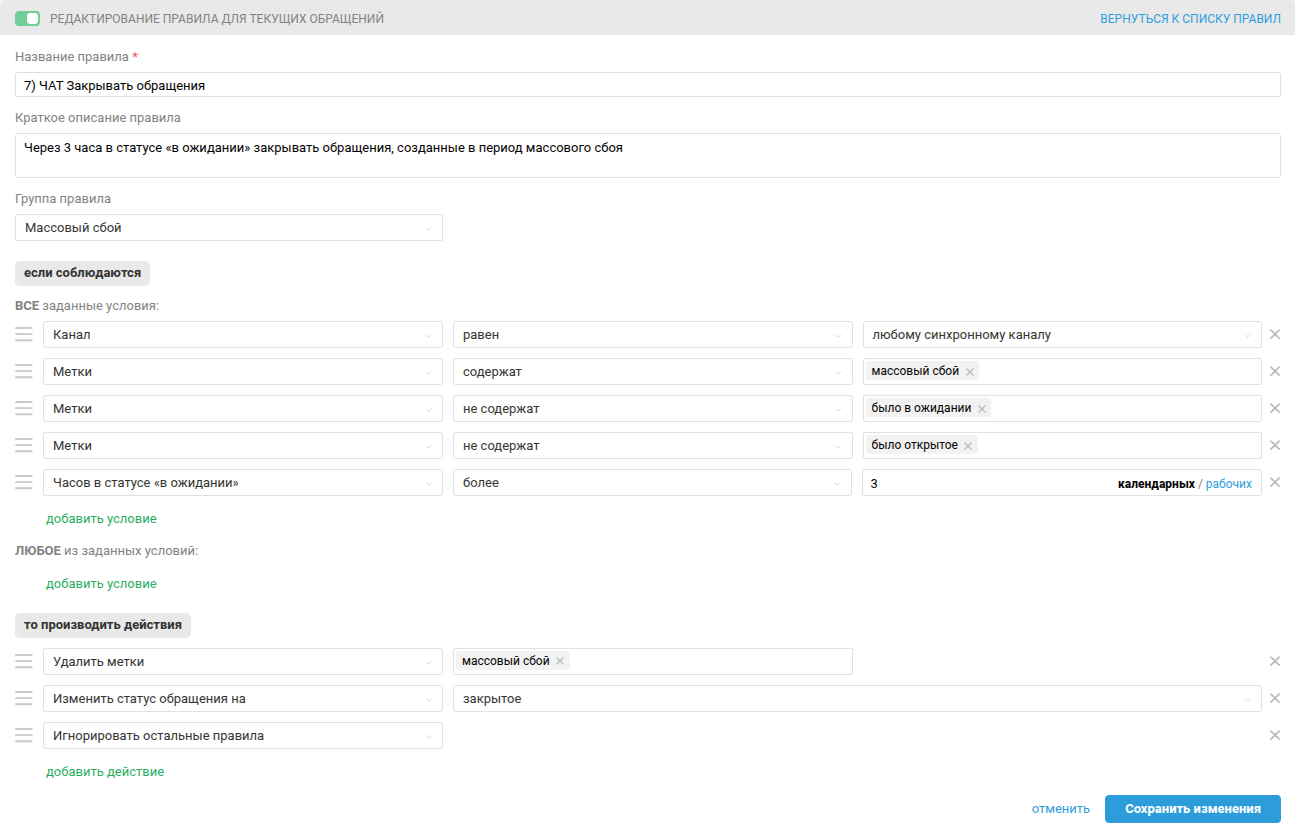 4) Правило для текущих обращений — спустя указанное вами время закрывает обращения, созданные во время массового сбоя и не требующие больше вашего внимания.