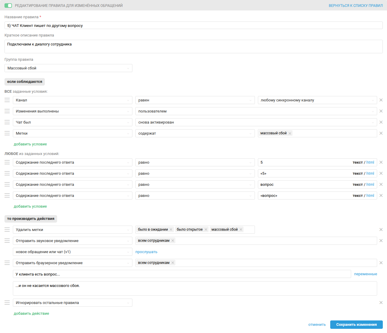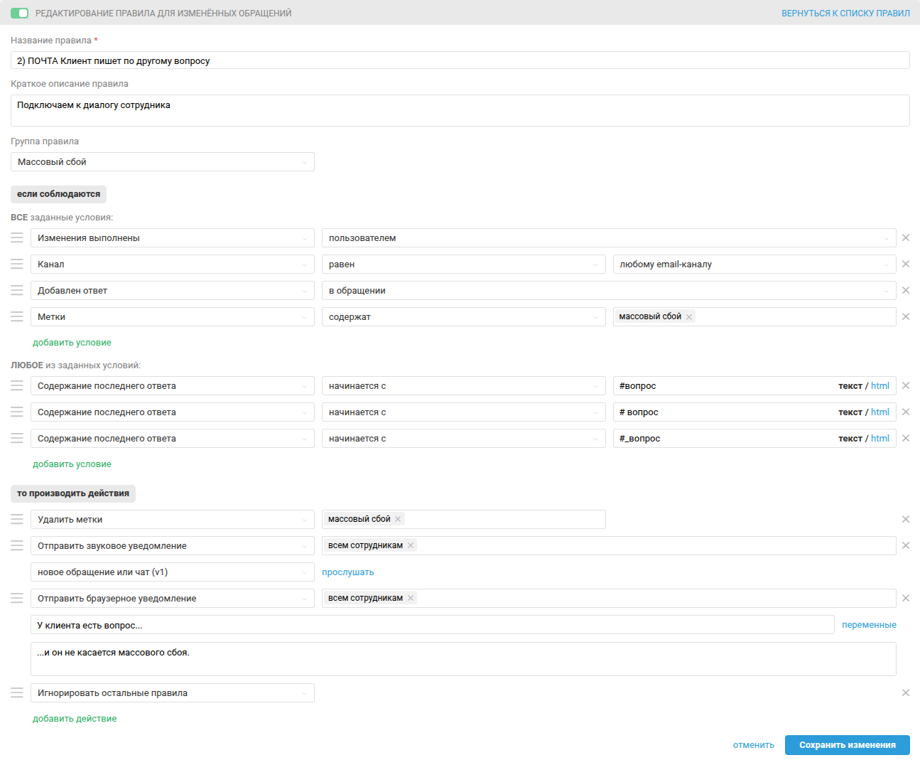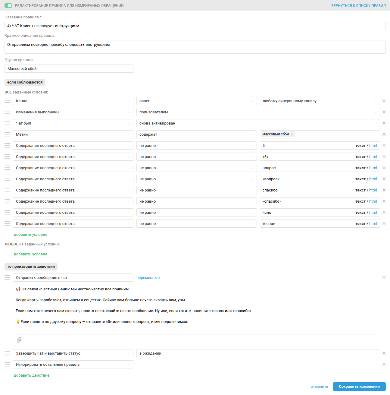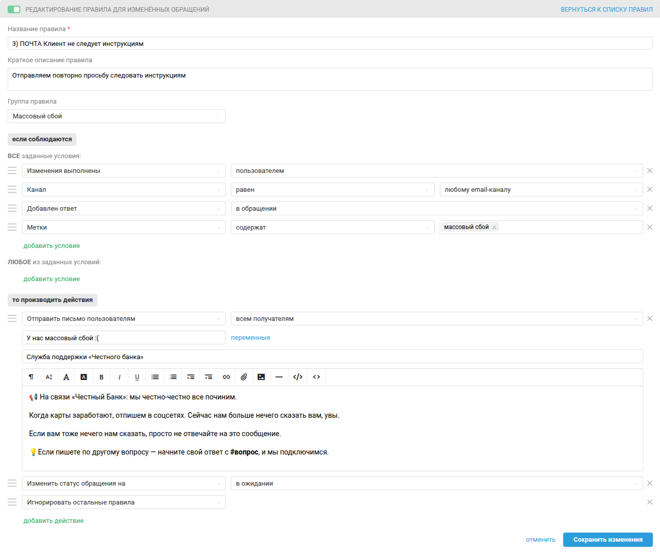 3) Правило для измененных обращений — если клиент не следует инструкции, отправляет ему автоответ с пояснениями.