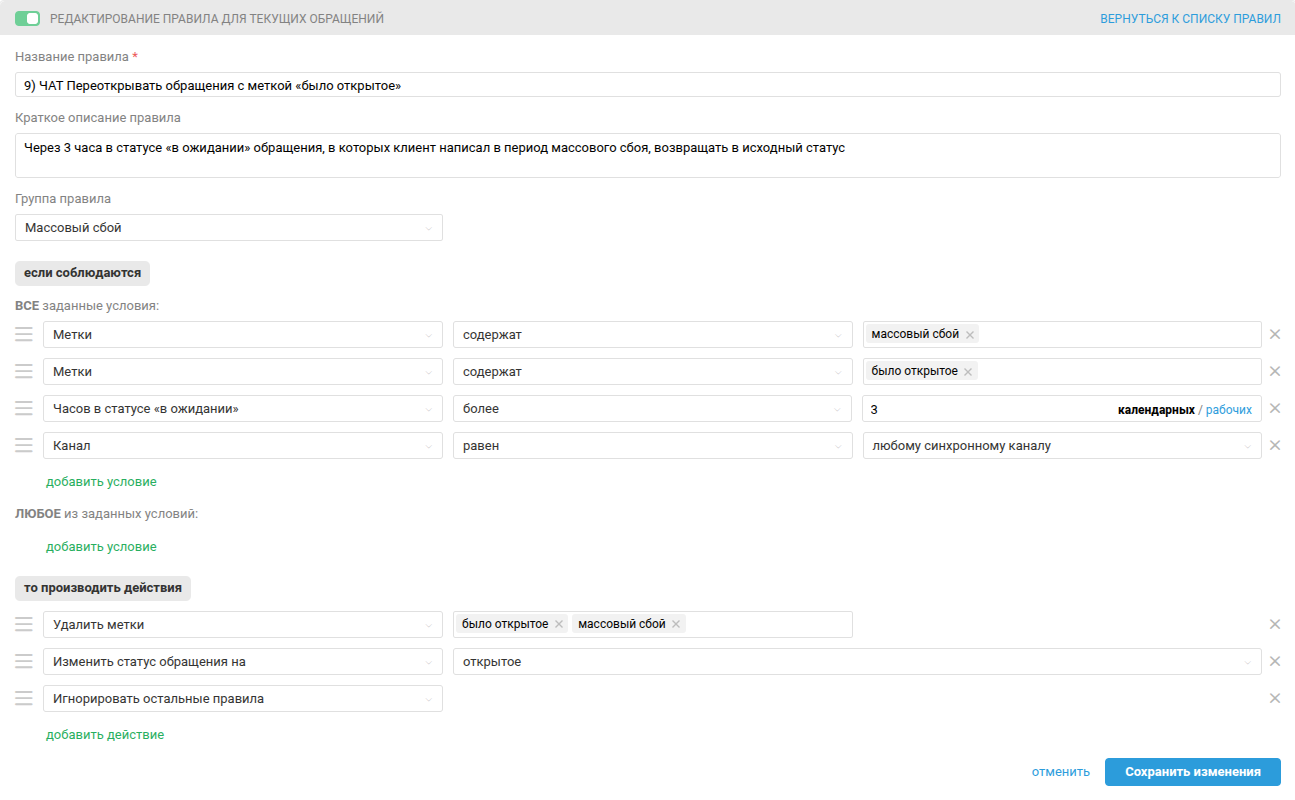Правило важно расположить на первом месте в группе правил для измененных обращений на случай массового сбоя.