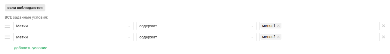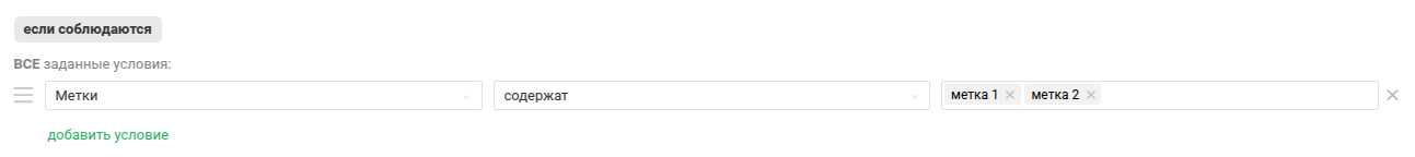 Когда метки указаны в одном условии, между ними используется логический оператор «ИЛИ» -- то есть для срабатывания правила в обращении должна быть хотя бы одна метка из перечисленных: