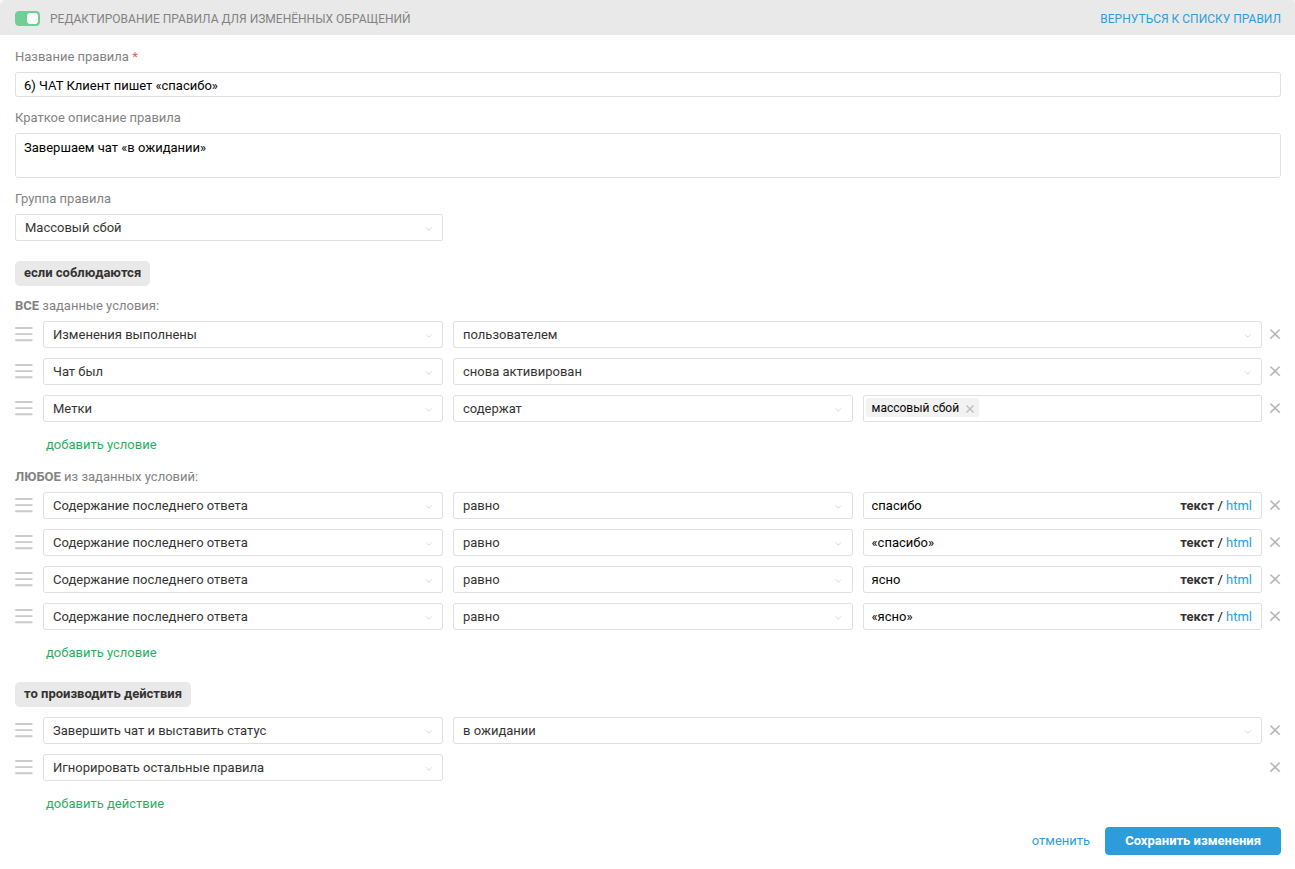 6) Правило для измененных обращений, чтобы завершать «в ожидании» чаты, в которых клиент отвечает фразой, по которой можно однозначно судить, что продолжение диалога не требуется — например, пишет «спасибо» или «ясно».