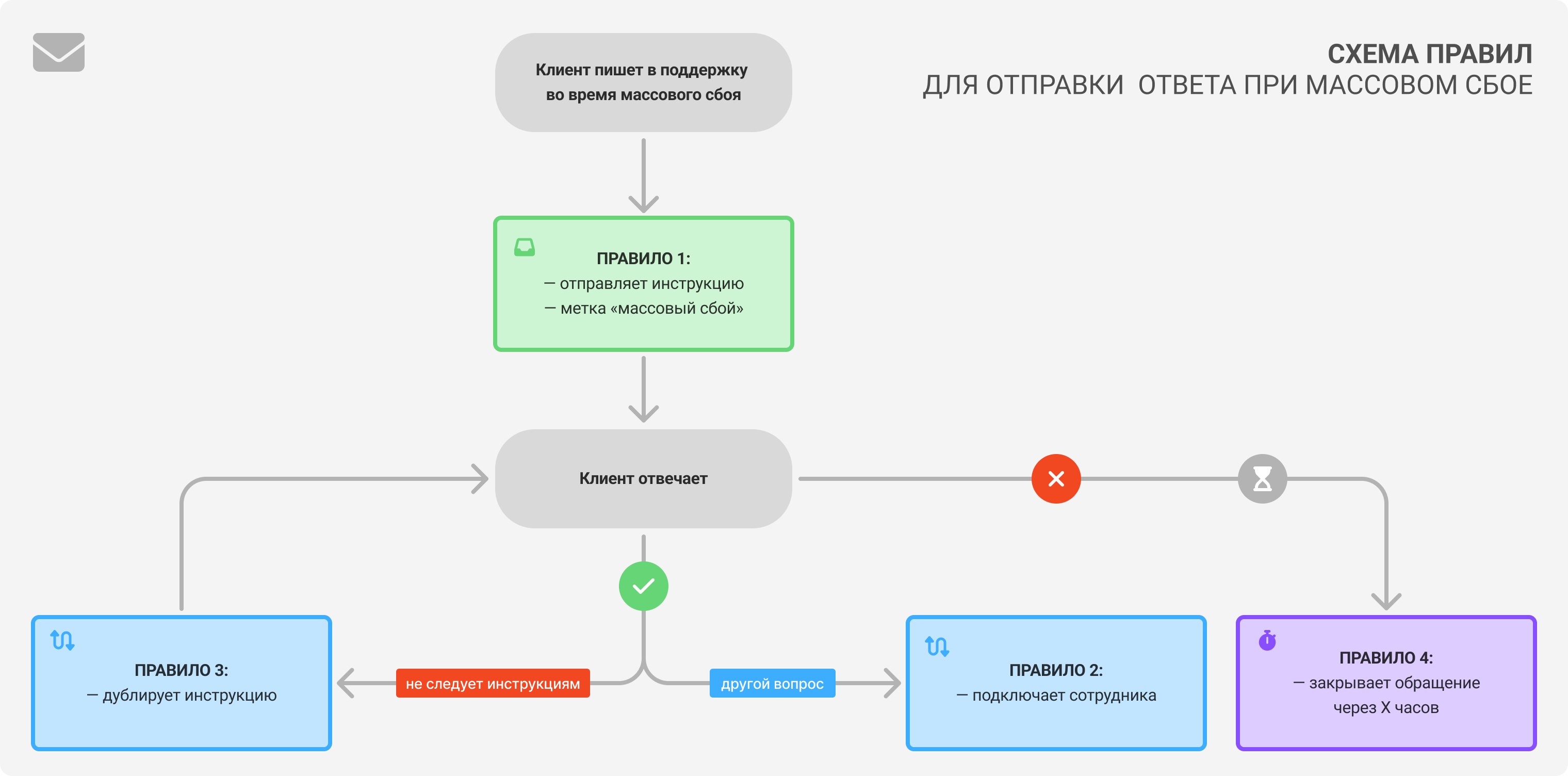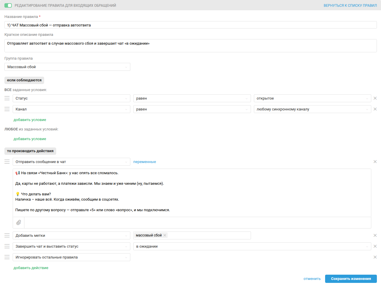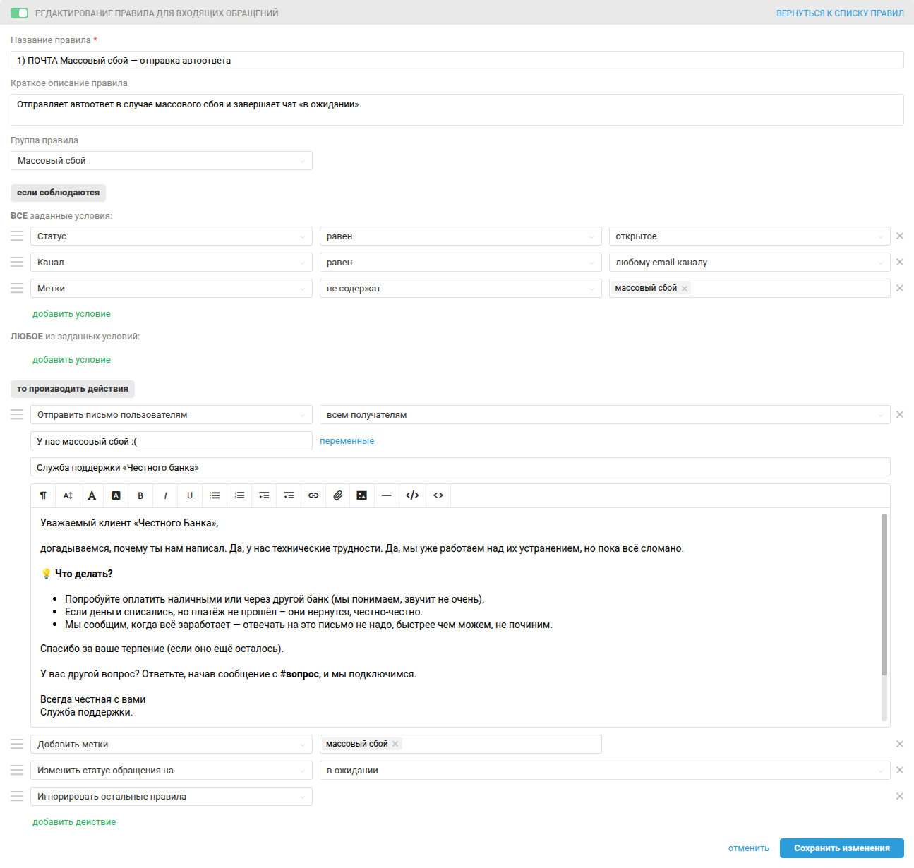 1) Правило для входящих обращений — отправляет автоответ клиентам, написавшим в момент массового сбоя: