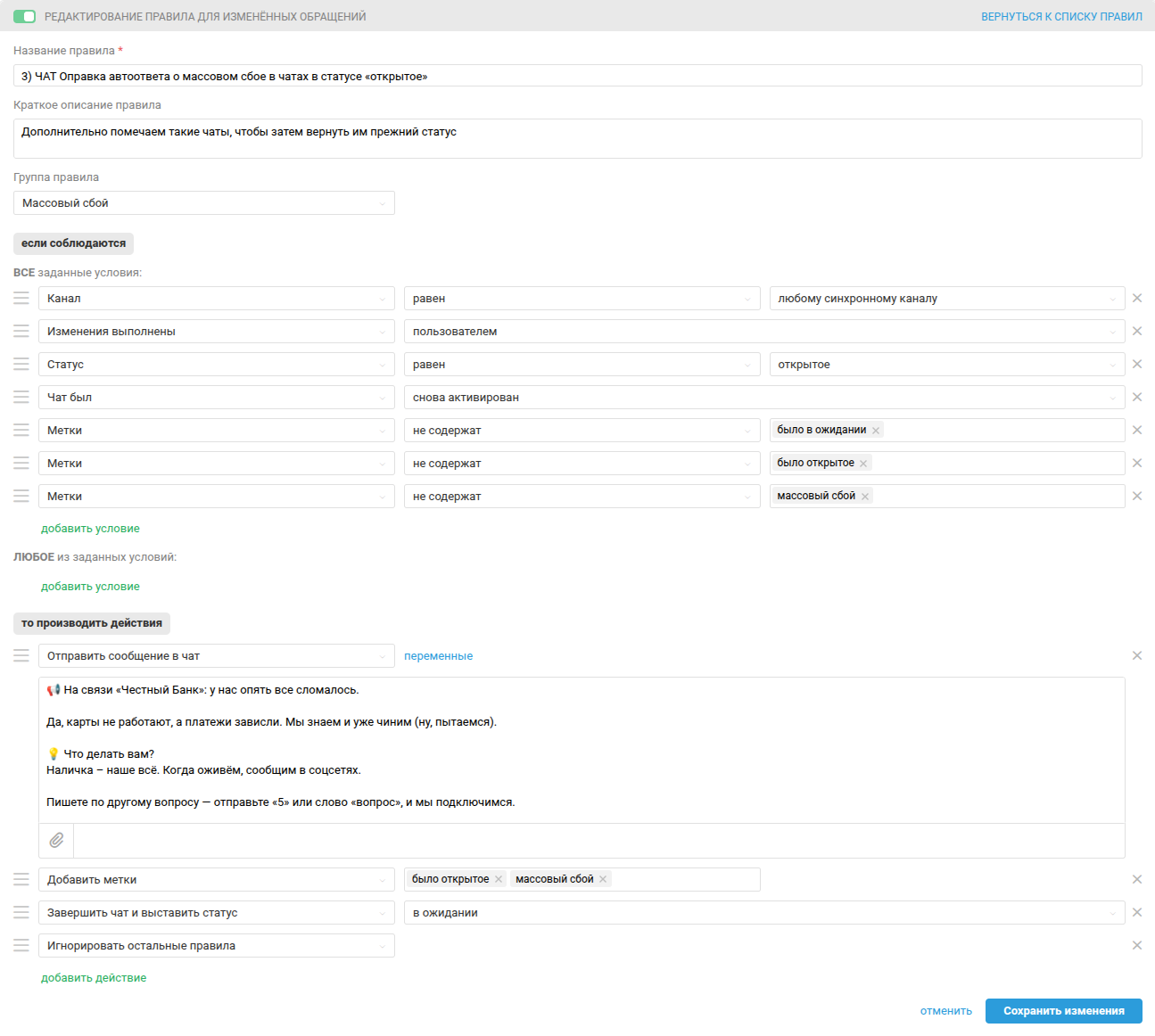 Обращения, созданные во время массового сбоя, надо закрыть или, если до массового сбоя с клиентом велась переписка, вернуть чату прежний статус — это поможет не оставить без внимания вопросы, которые обсуждались с клиентом ранее. Будем делать это через правила для текущих обращений.