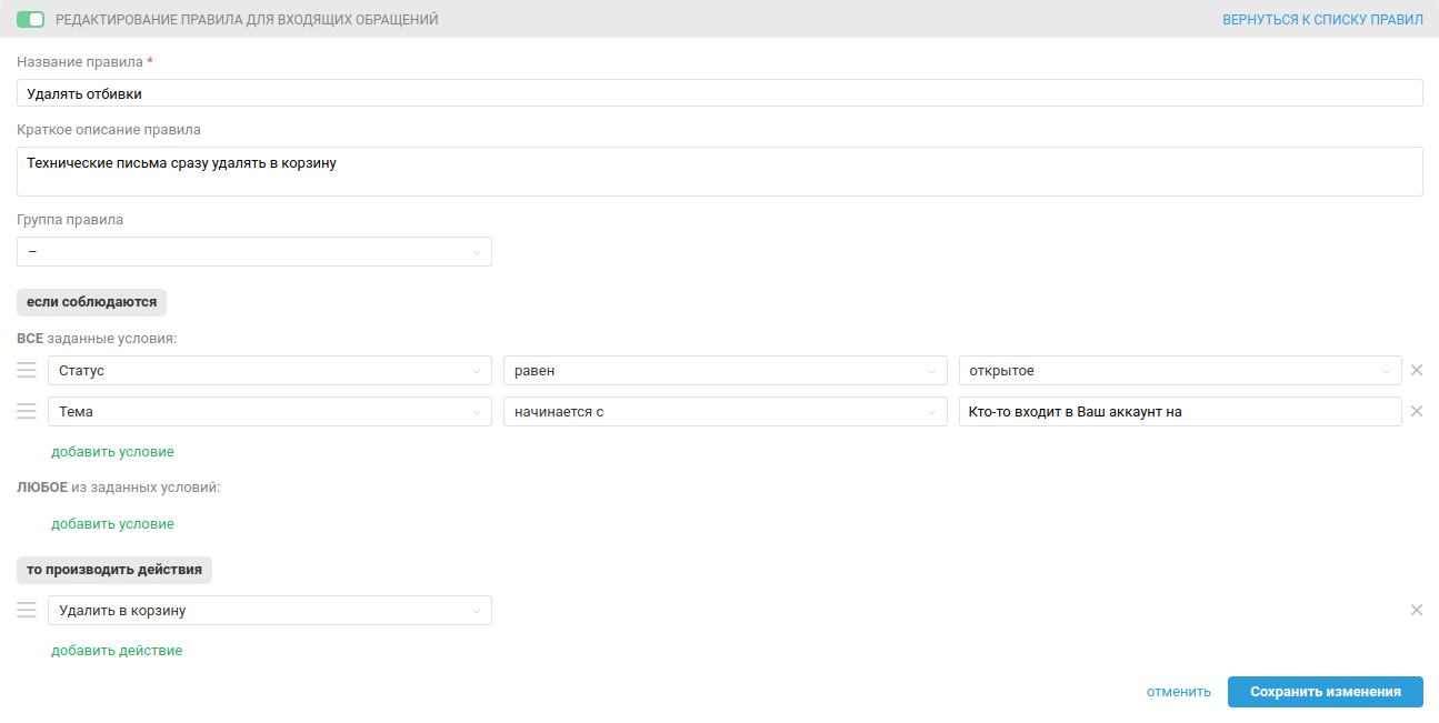1) Вы получаете на подключенный к Омнидеску почтовый ящик технические уведомления от сервисов, которые вам не нужны. С помощью правила для входящих обращений вы можете автоматически отправлять такие письма в корзину, отслеживая их через тему письма.