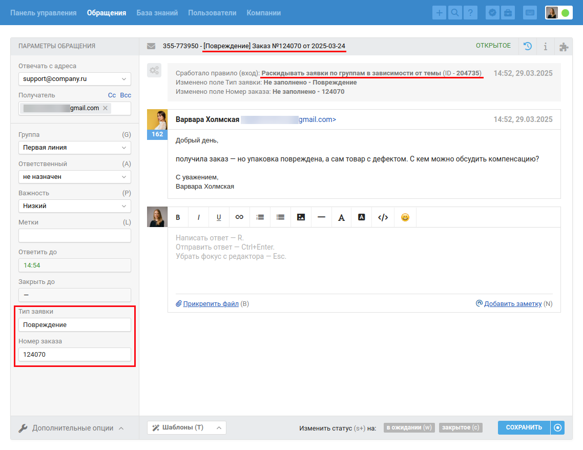 3) Клиенты оставляют заявки через личный кабинет, и тема обращения формируется по шаблону: [Тип обращения] Заказ #<номер> от <дата>. Можно извлекать из темы нужные вам данные и записывать их в заранее созданные кастомные поля с принадлежностью к обращению.