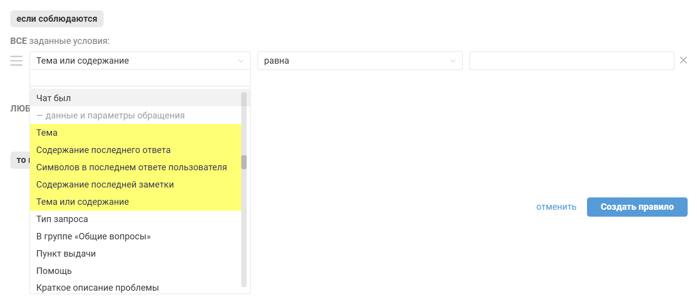 В условиях всех типов правил есть возможность проверять на совпадение текст темы обращения или сообщения. При этом Омнидеск не анализирует текст, как это делает AI, а именно выполняет точную проверку на совпадение по заданным условиям.