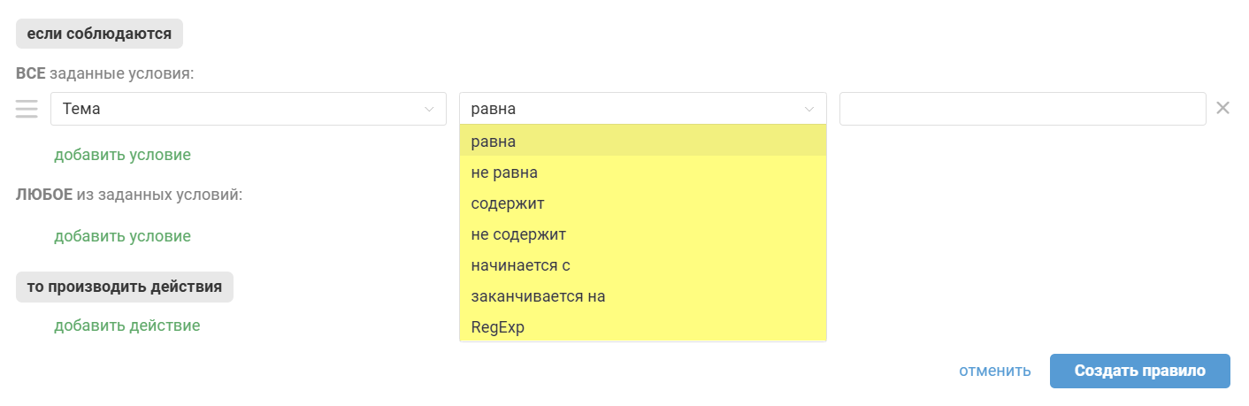 Равно / не равно — проверка на точное совпадение, включая пробелы;