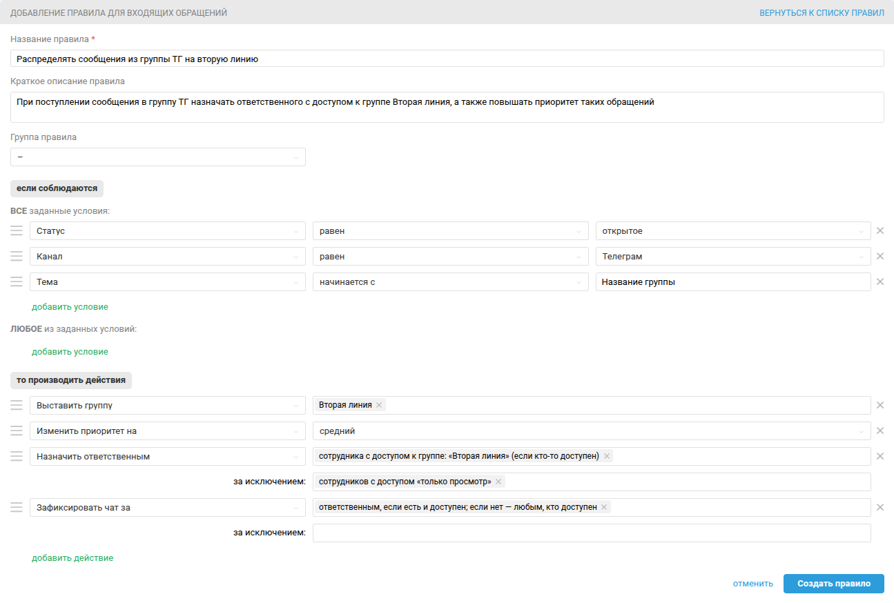2) В групповых чатах Telegram название группы автоматически подставляется в тему обращения в Омнидеске. Чтобы распределять такие обращения между нужными сотрудниками или выполнять другие действия, используйте условие: «Тема — начинается с — [название группового чата]».