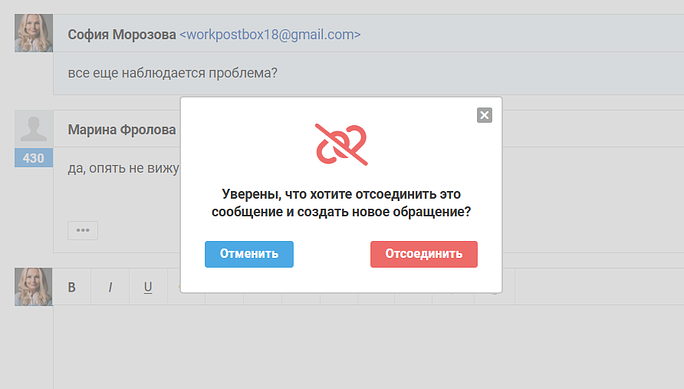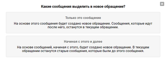 б) Если заметка из середины переписки с адресатом пересылки, то в модальном окне надо будет выбрать, как поступить с последующими сообщениями: оставить в старом обращении или отсоединить к новому: