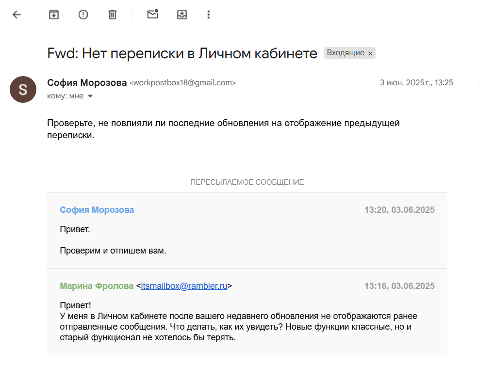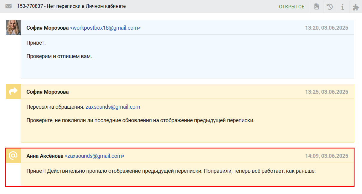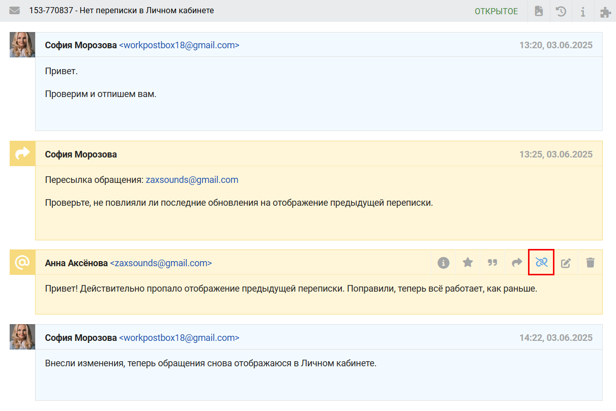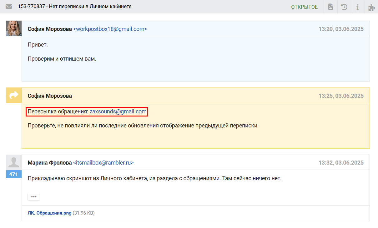 - Если в обращении есть прикрепленные файлы, то при пересылке ссылки на них добавляются в соответствующем месте переписки.