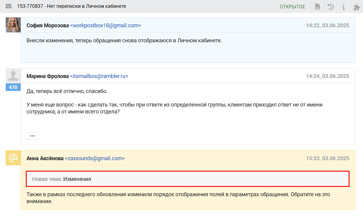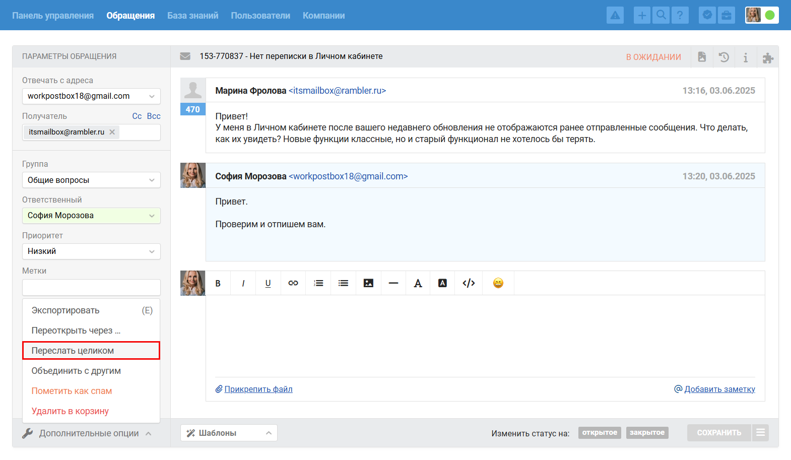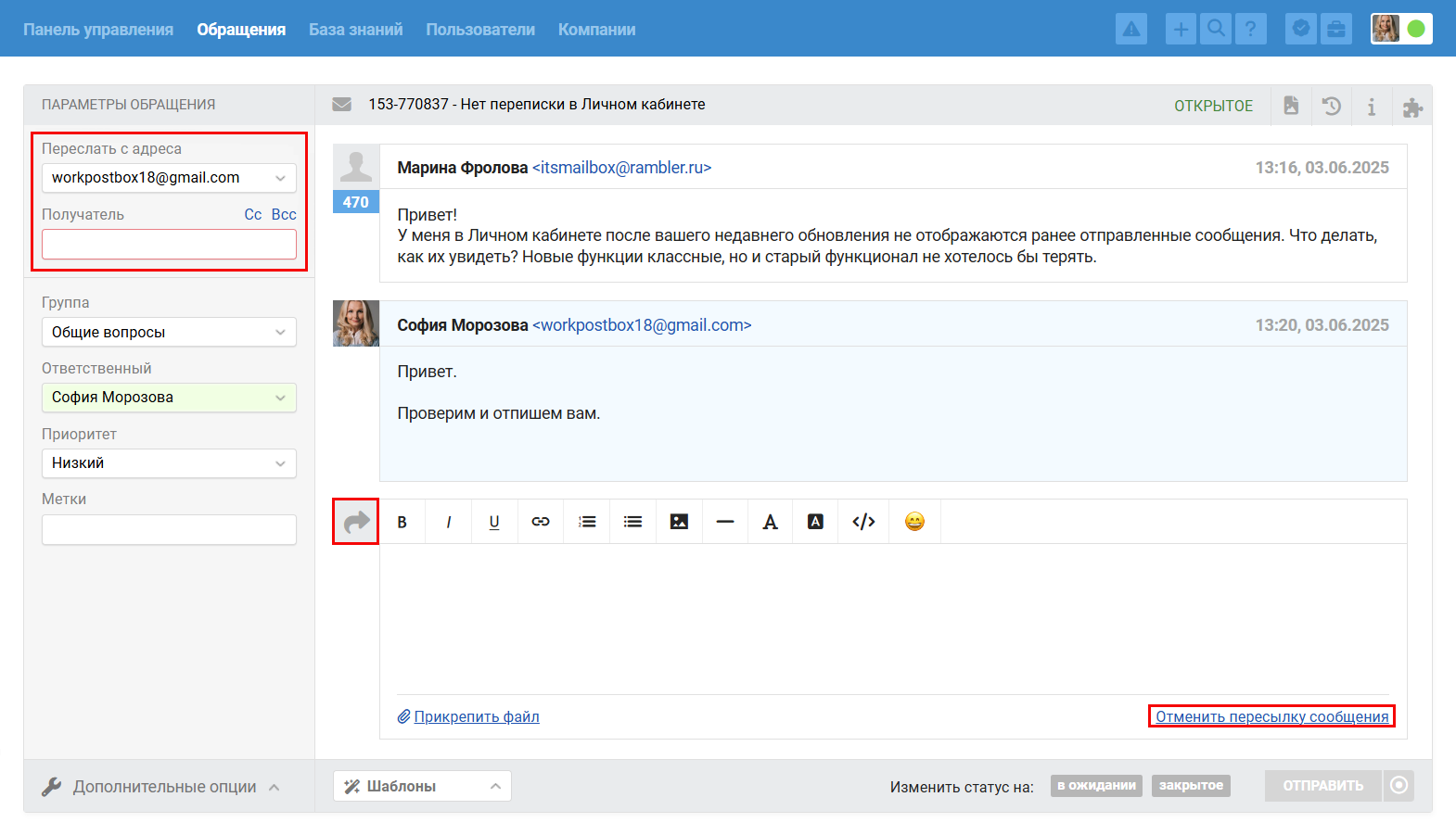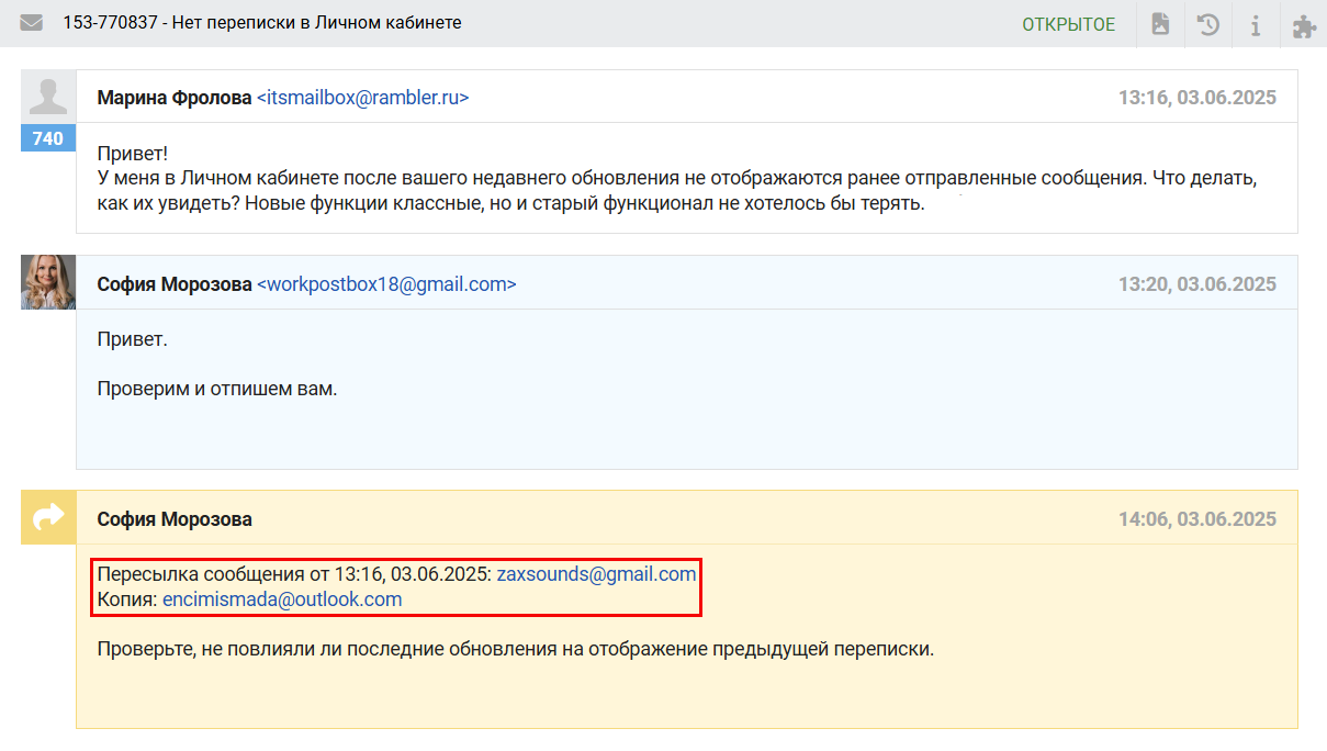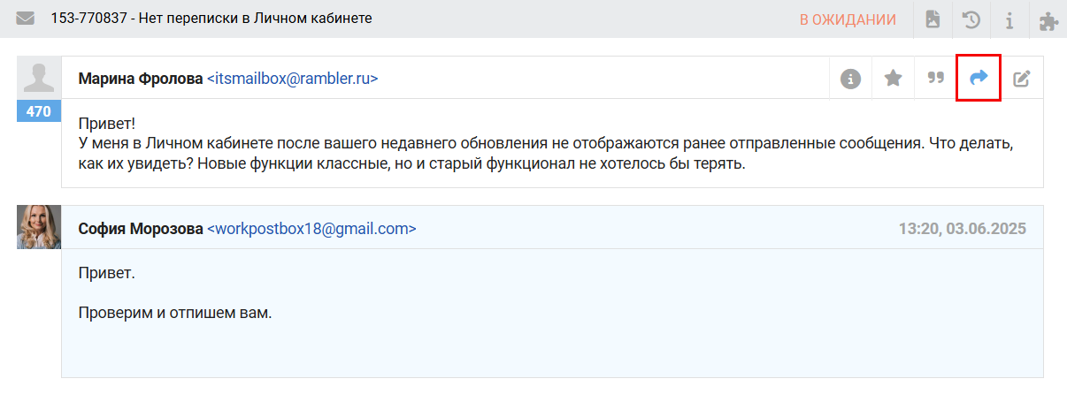 - Ответ на пересылку из внешней почты добавляется в обращение как заметка, клиент текст такого ответа не увидит.