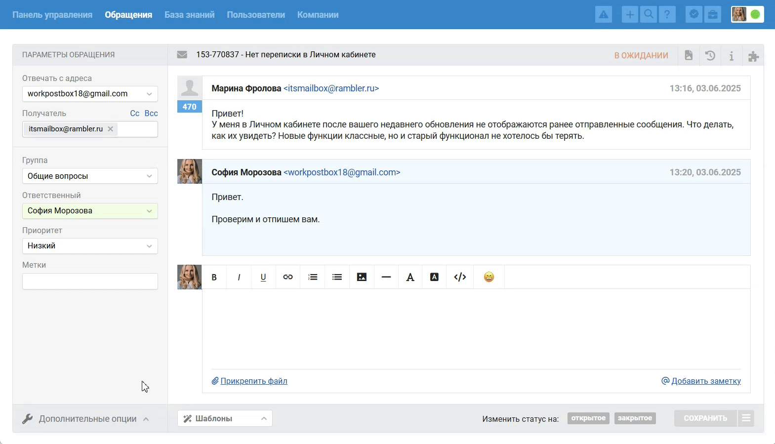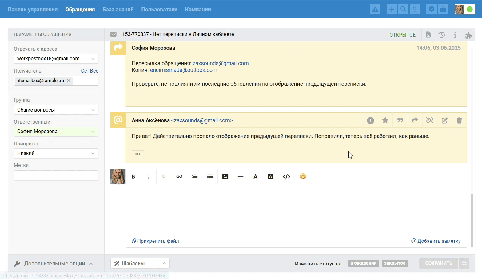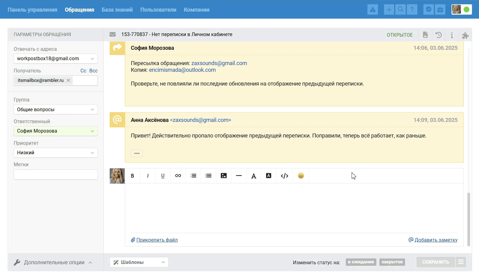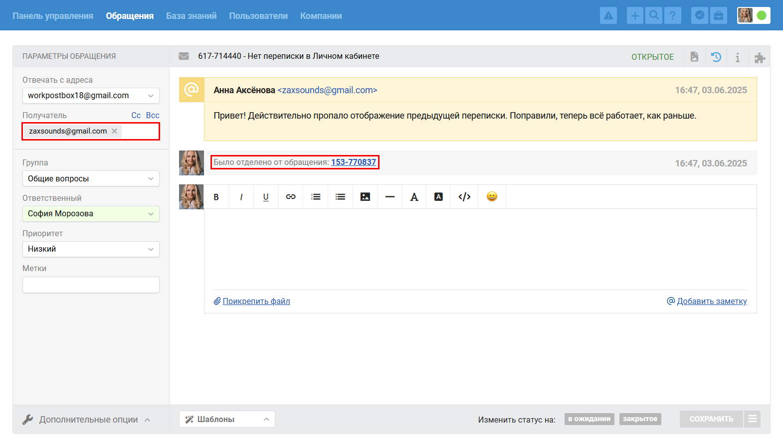 - Ответ на пересылку из внешней почты добавляется в обращение как заметка, клиент текст такого ответа не увидит.