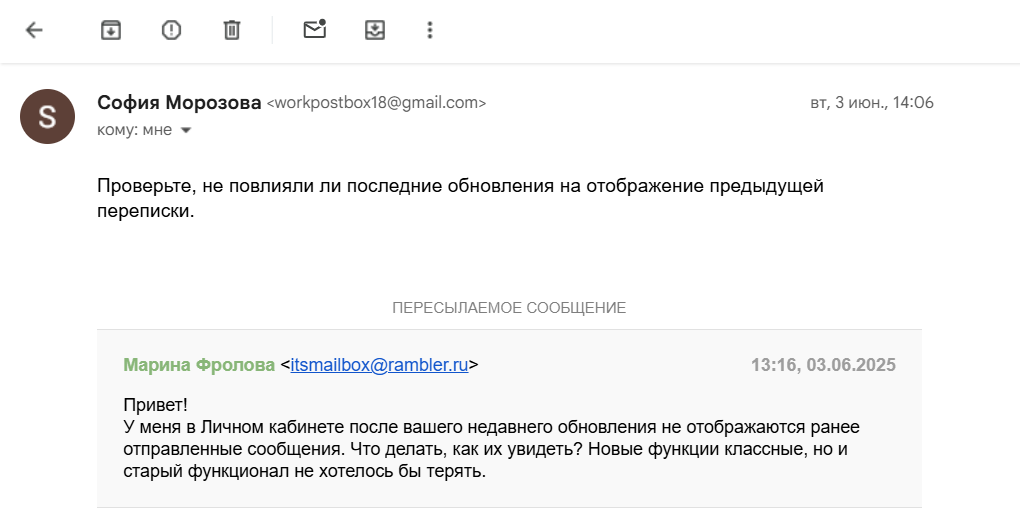 - Если при ответе на пересылку из своего почтового ящика пользователь поменяет тему письма, мы отобразим это в заметке.