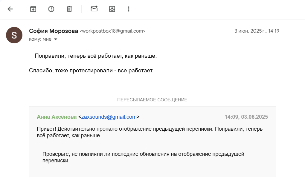 Чтобы у принимающей стороны письма собирались в цепочку и получатель не терял контекст, мы добавляем к ответу блок с сообщением, на которое отвечает сотрудник, и служебные заголовки «In-Reply-To» и «References».