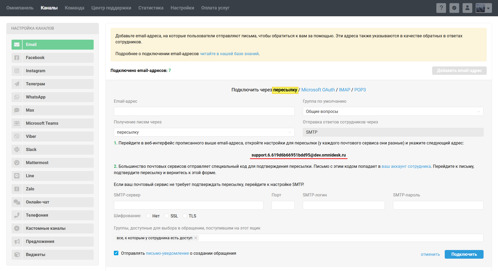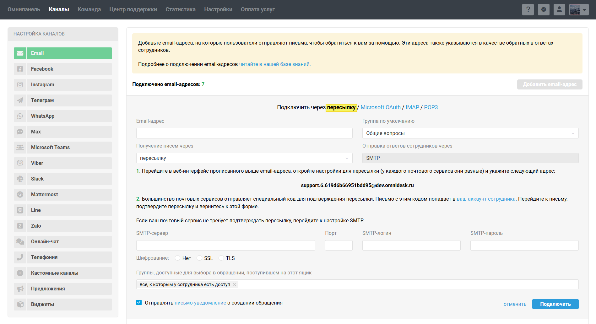 1. Перейдите в аккаунт администратора в Омнидеске в раздел Каналы → подраздел Email, нажмите «добавить email-адрес» → в опции «Подключить» выберите пересылку