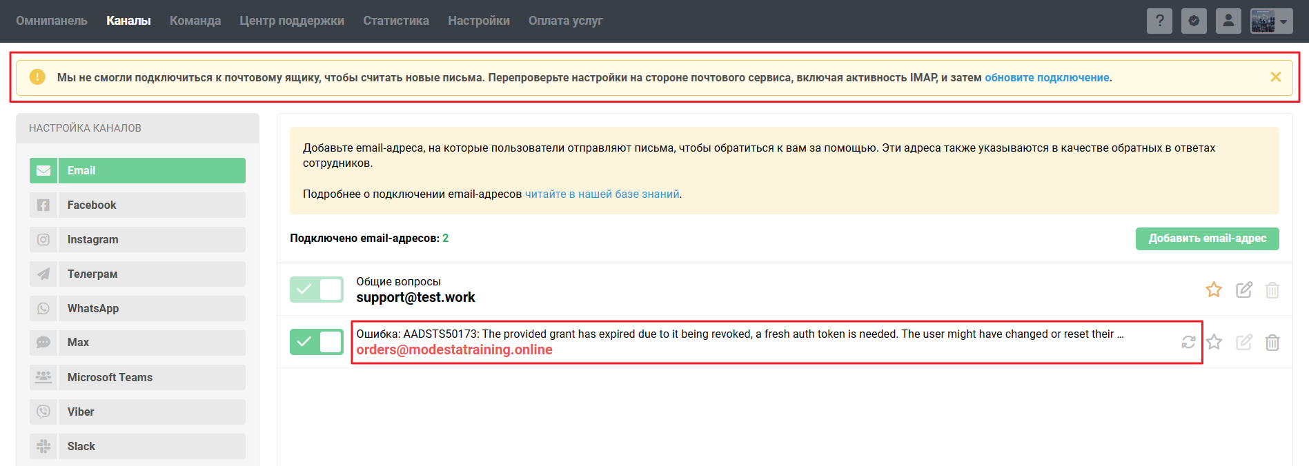 Если по тем или иным причинам соединение с почтовым ящиком Microsoft было потеряно, в шапке аккаунта администратора и сотрудника отображается соответствующее уведомление. В подразделе «Email» раздела «Каналы» такой почтовый ящик выделяется красным цветом, с текстом полученной от почтового сервера ошибки и кнопкой «Обновить».