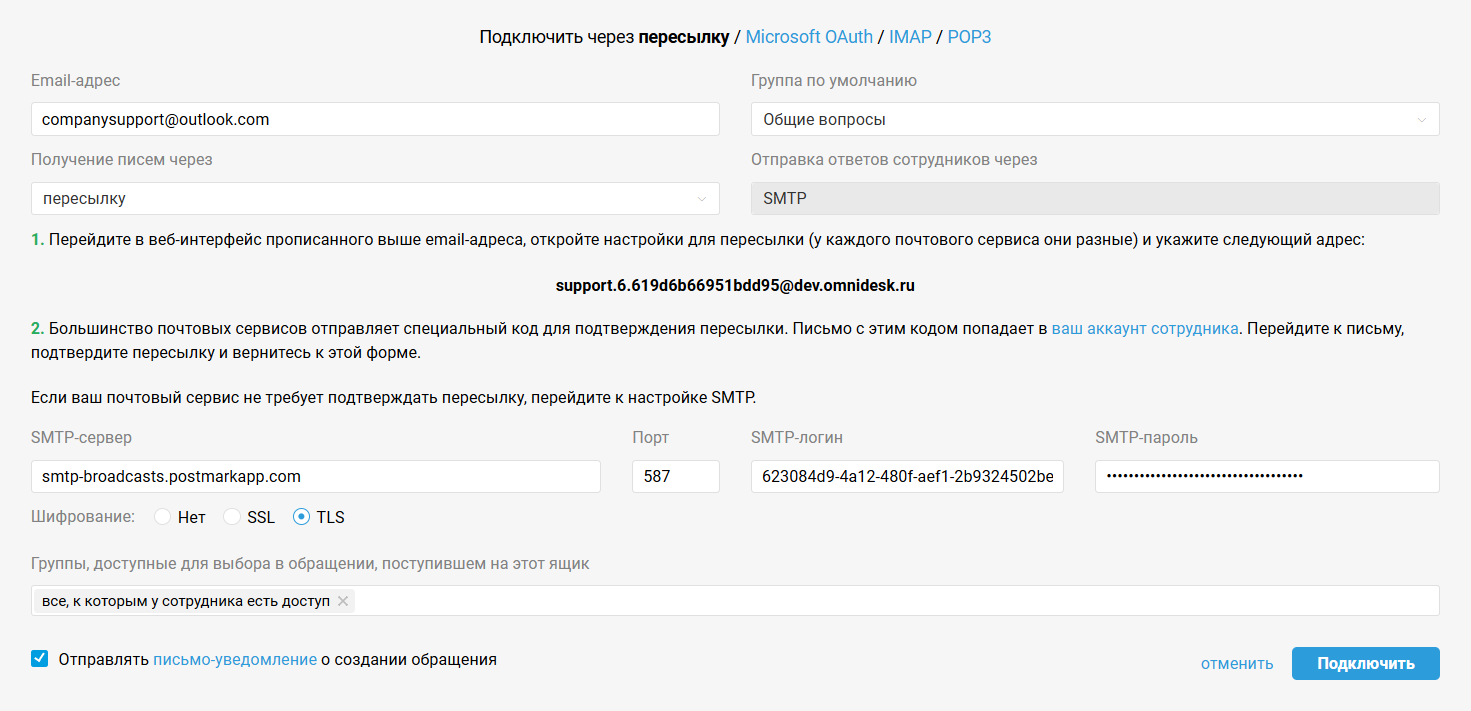 Для подключения ящика Microsoft через пересылку вам нужно на стороне своего почтового сервиса настроить пересылку всех или только нужных писем на ваш системный ящик в Омнидеске, а затем в форме подключения канала указать данные вашего ящика и SMTP-сервера, через который вы будете отправлять ответы сотрудников.
