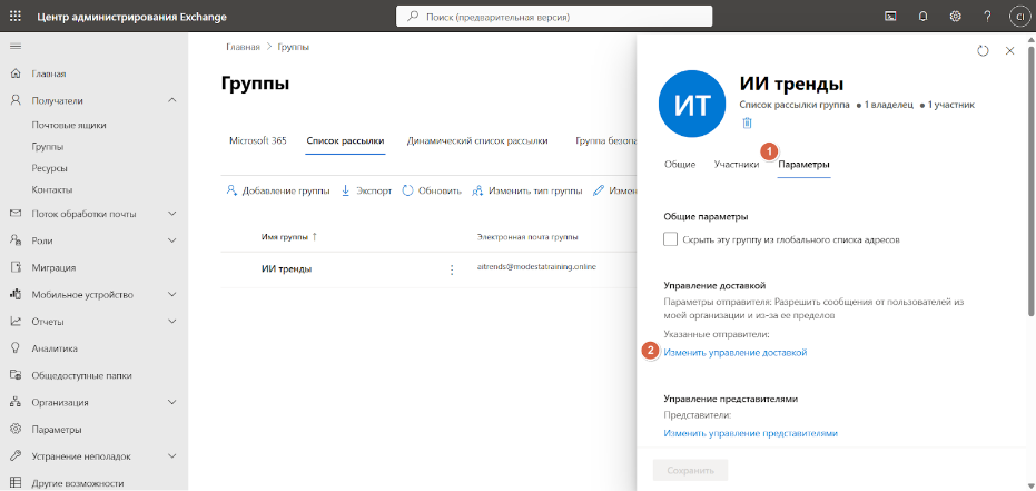 1. Добавьте реальный корпоративный почтовый ящик Exchange Online в качестве участника и владельца группы или списка рассылки;