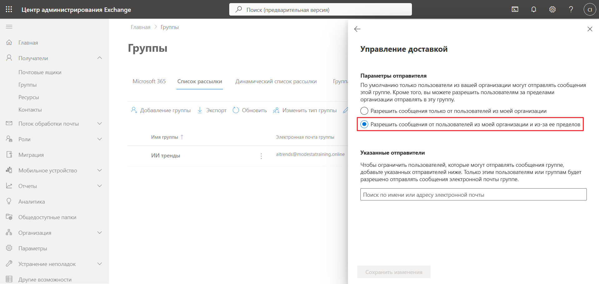 • Разрешить внешним отправителям посылать сообщения этой группе;