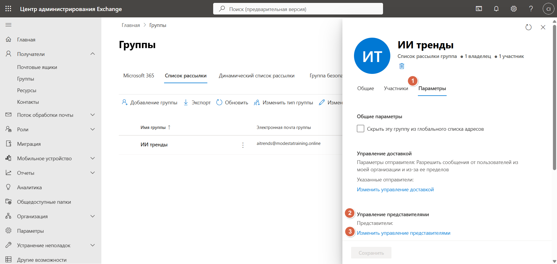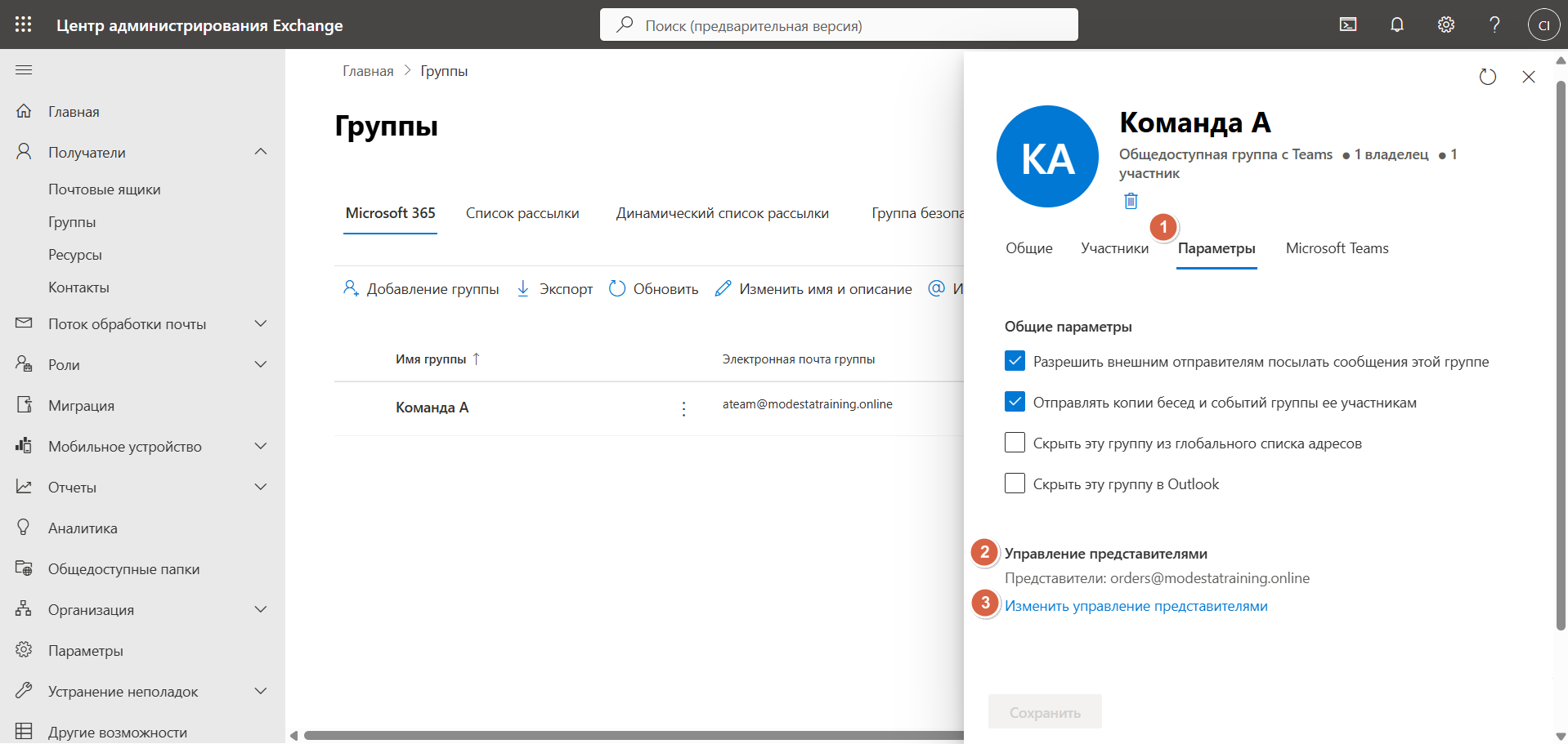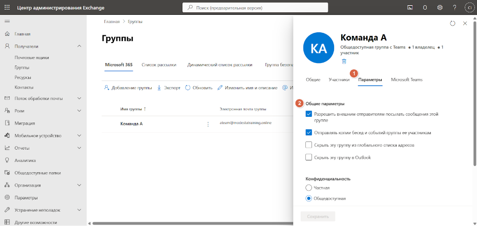 В Центре администрирования Exchange перейдите в раздел Группы и кликните по названию подключаемой группы. В открывшемся окне перейдите в раздел Параметры: