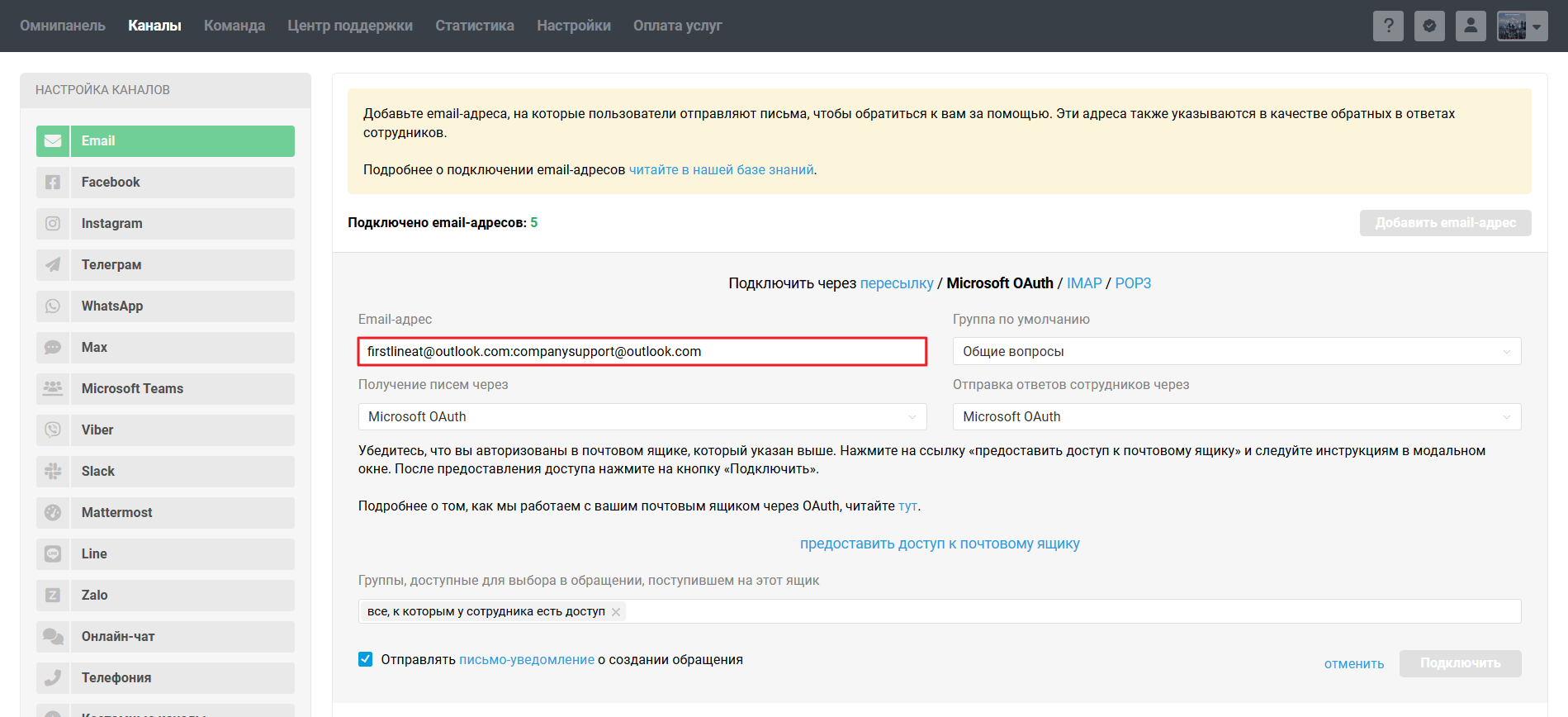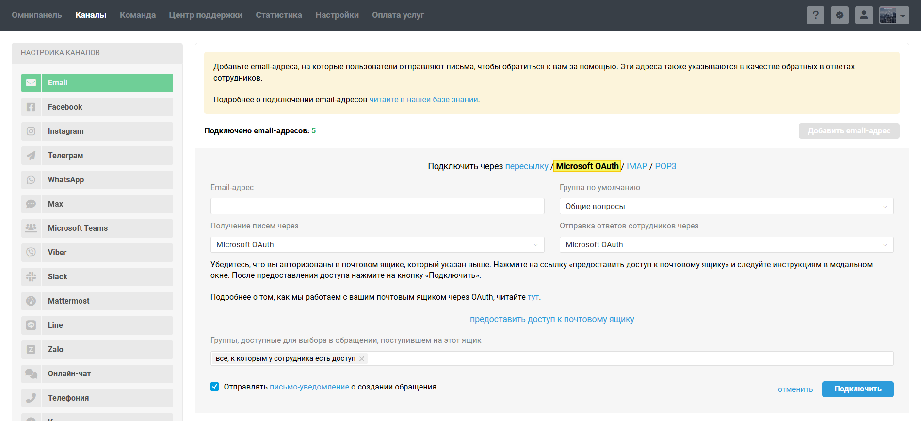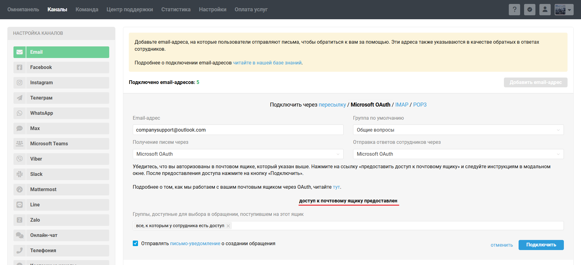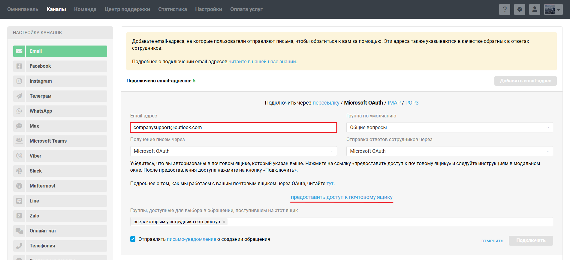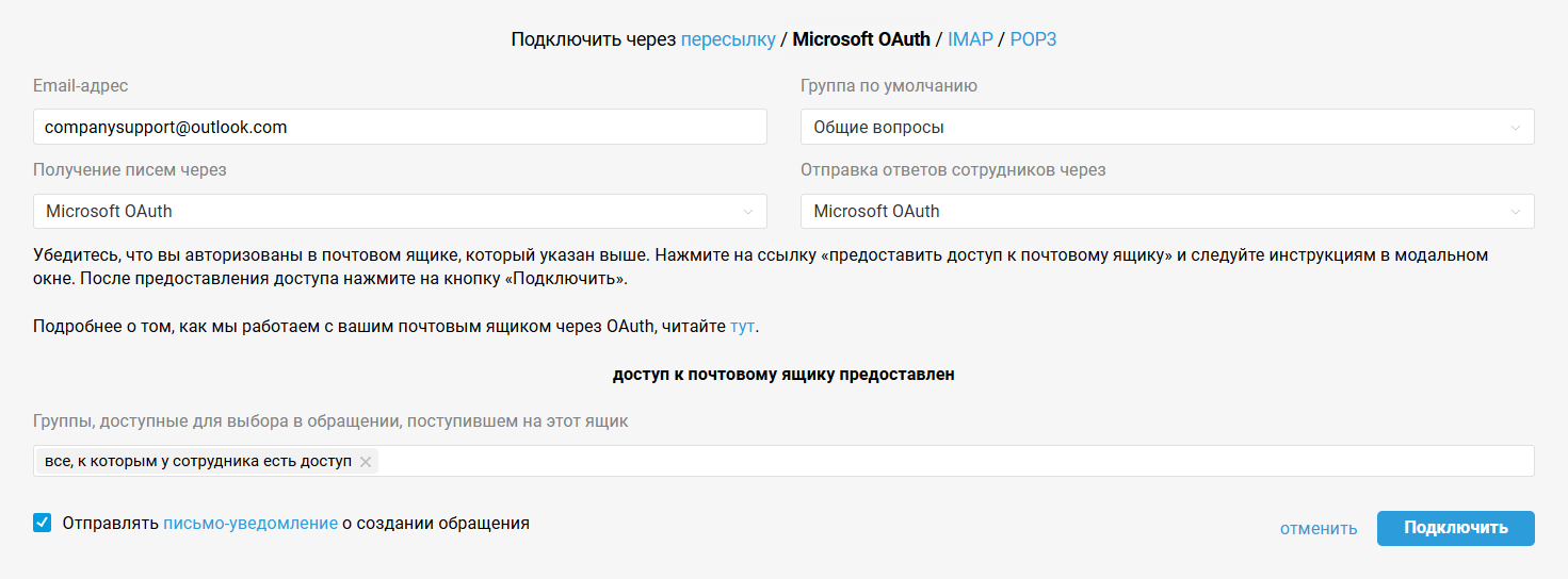 • для Microsoft OAuth — пройдите авторизацию в ящике, кликнув на «предоставить доступ к почтовому ящику» в форме подключения канала в Омнидеске;