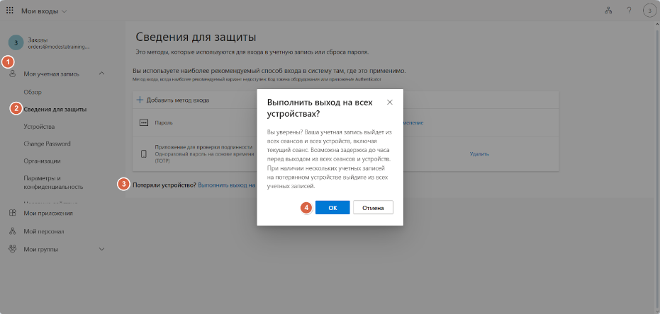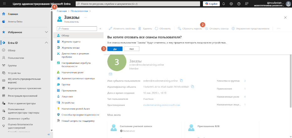 б) Корпоративный почтовый ящик: если глобальный администратор отзовет активные сессии в консоли Microsoft Entra для почтового ящика Exchange Online либо владелец такого почтового ящика выполнит выход из всех устройств в рамках своей учетной записи, Омнидеск потеряет доступ к почтовому ящику, а также ко всем группам / спискам рассылки, которые были подключены к Омнидеску через него.