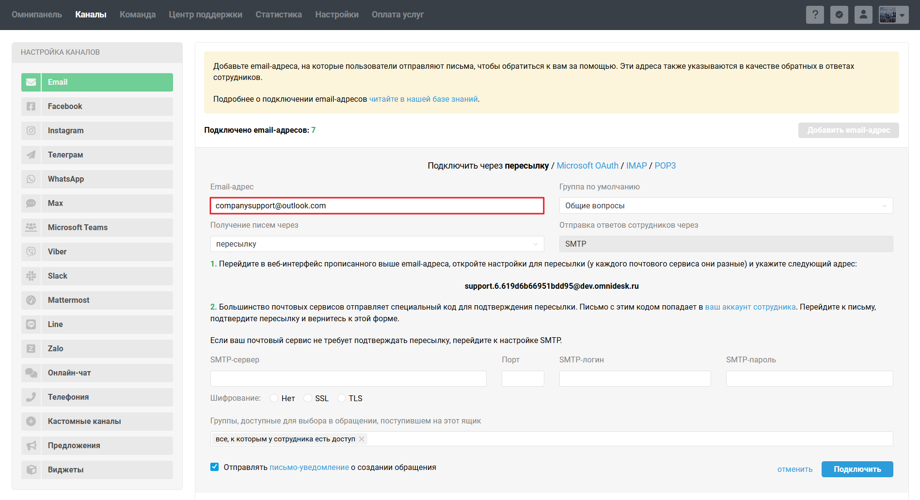 В аккаунте администратора Омнидеска перейдите по пути Каналы — Email, нажмите на «Добавить email-адрес» — по умолчанию откроется форма подключения ящика через пересылку. Скопируйте ваш системный адрес — именно на него нужно будет настроить пересылку в интерфейсе Microsoft.