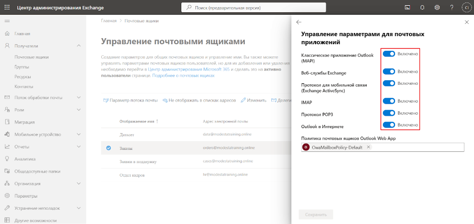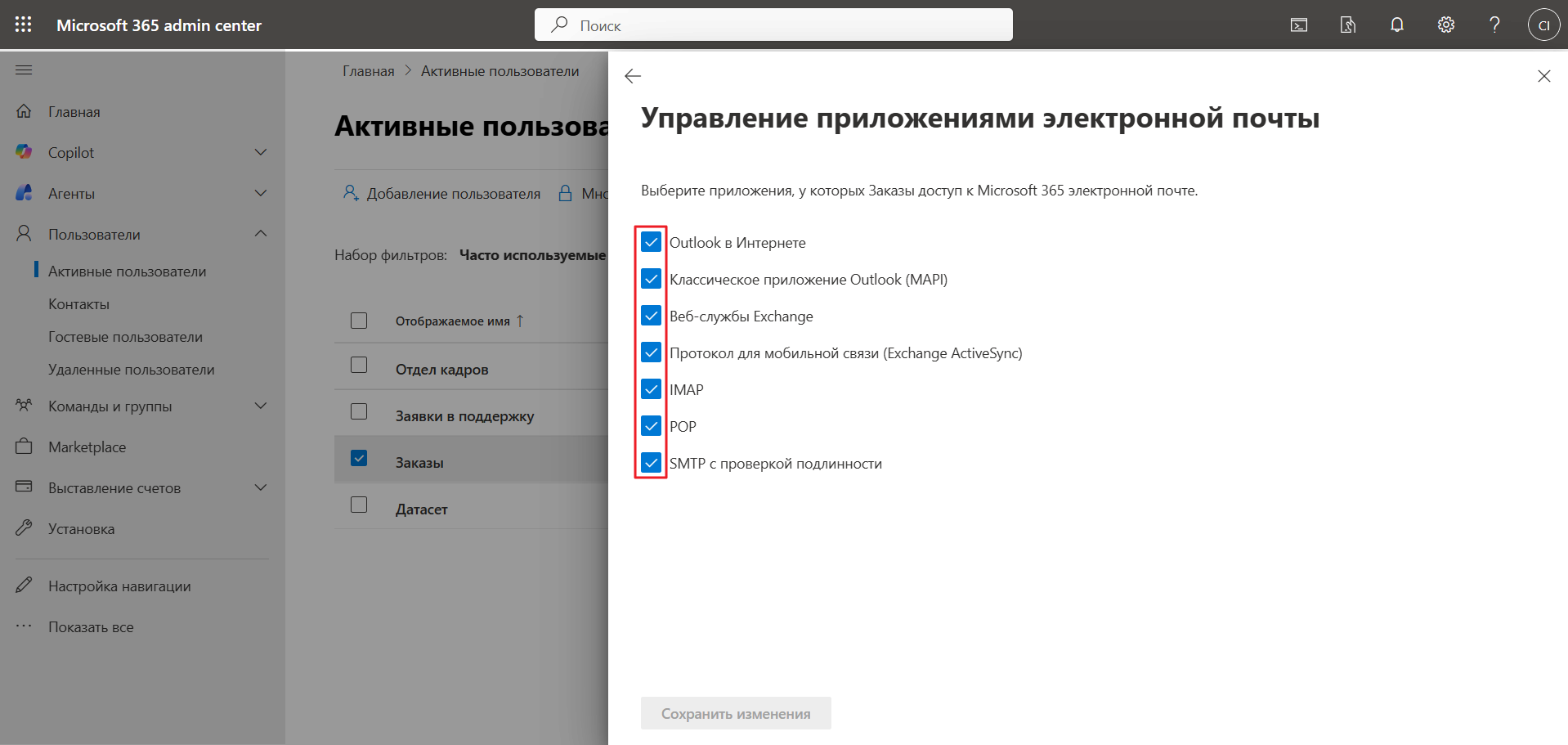 1. В Microsoft 365 Admin Center перейдите в раздел Активные пользователи и кликните на пользователя, чей почтовый ящик планируете подключить. В открывшемся окне перейдите по пути Почта — Управление приложениями электронной почты. В раскрывшемся списке активируйте все чекбоксы и сохраните изменения.