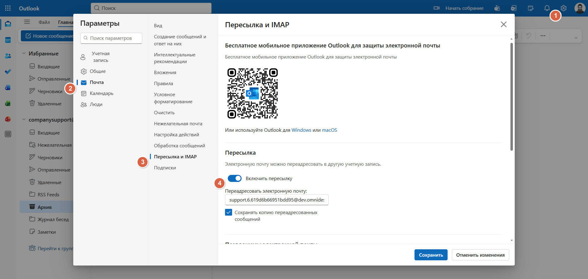 В настройках почтового ящика Microsoft настройте пересылку на ваш системный ящик в Омнидеске. Сделать это можно по пути Параметры — Почта — Пересылка и IMAP — Пересылка.
