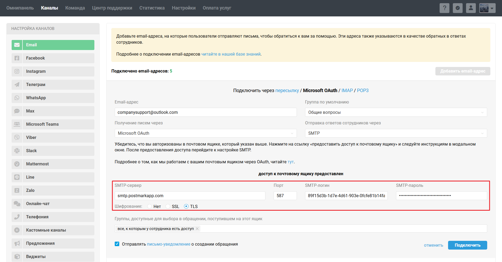 • Microsoft OAuth (вариант по умолчанию) — используется SMTP подключаемого почтового ящика;