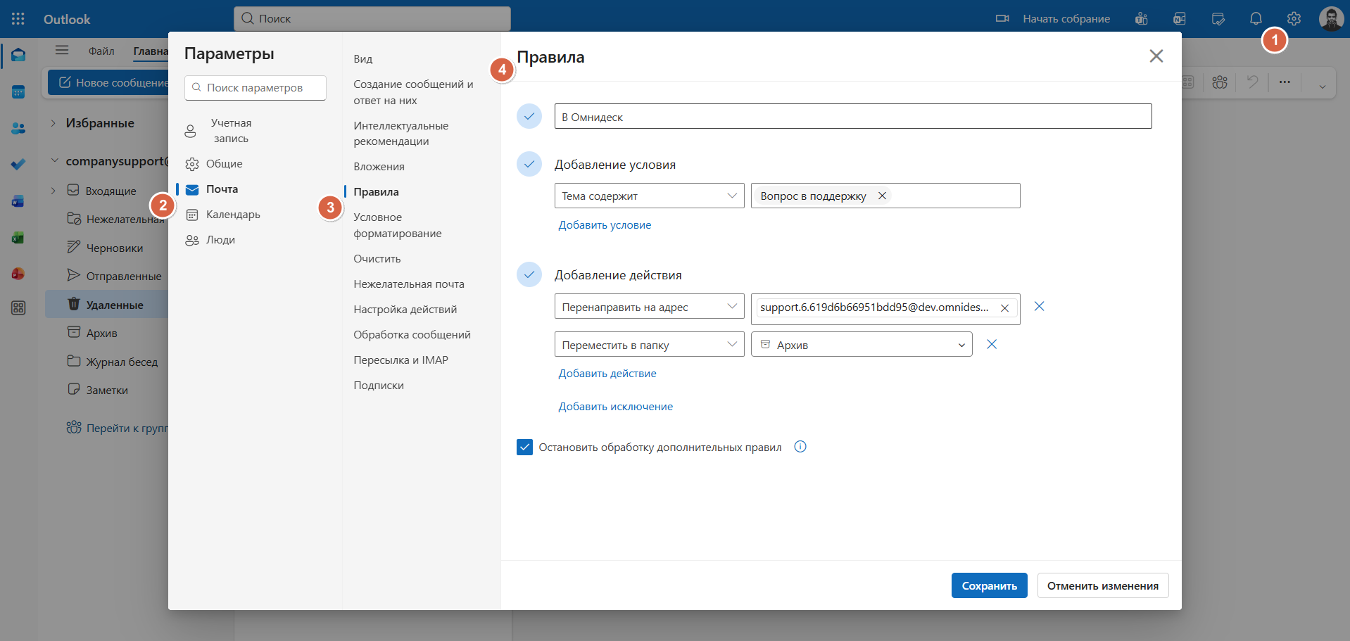 Если вы хотите, чтобы не все письма из ящика поступали в Омнидеск как обращения, настройте пересылку на ваш системный ящик в Омнидеске через правила по пути Параметры — Почта — Правила.