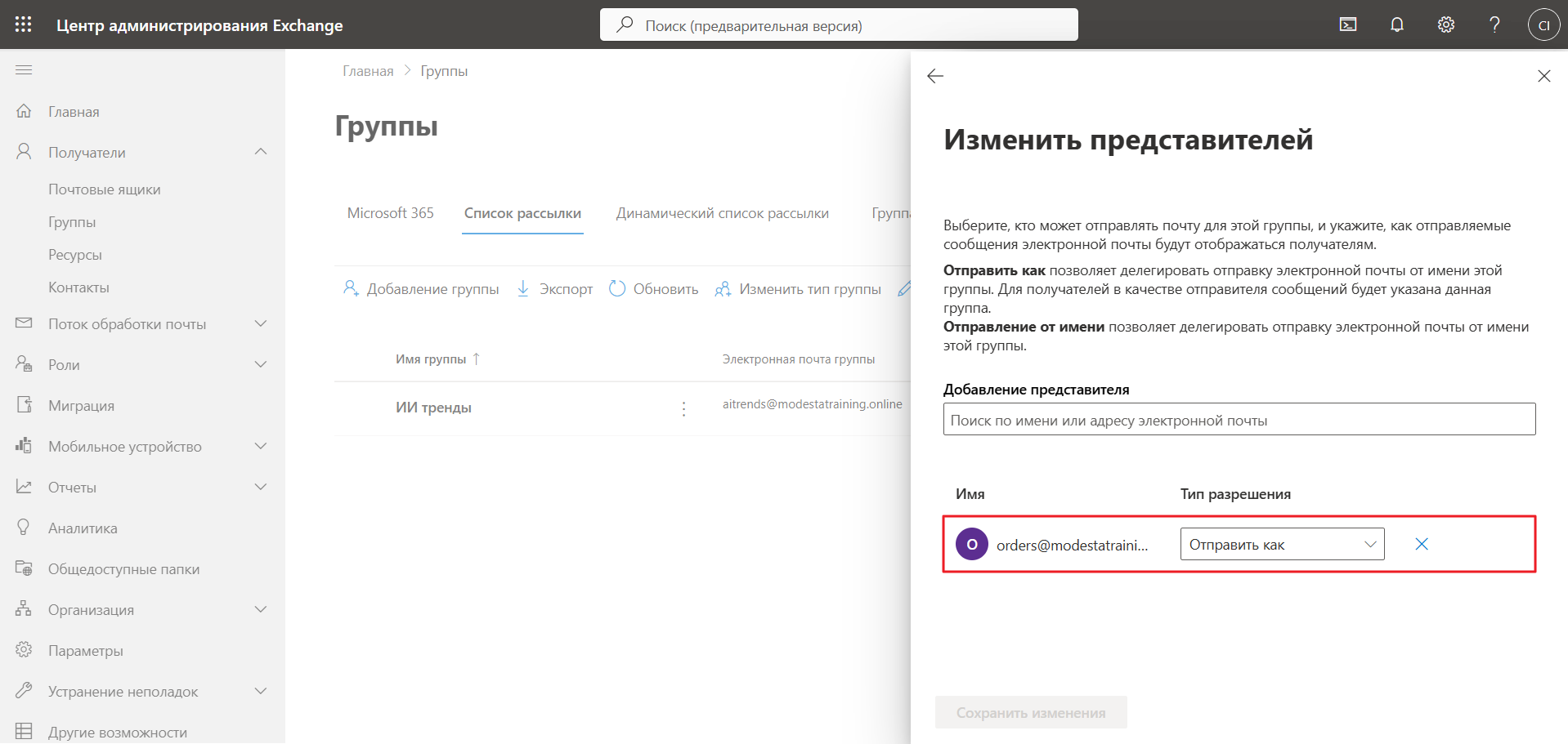 б) В подразделе Управление представителями кликните на Изменить управление представителями и укажите в опции Отправить как реальный почтовый ящик Exchange Online, через который вы планируете выполнять подключение: