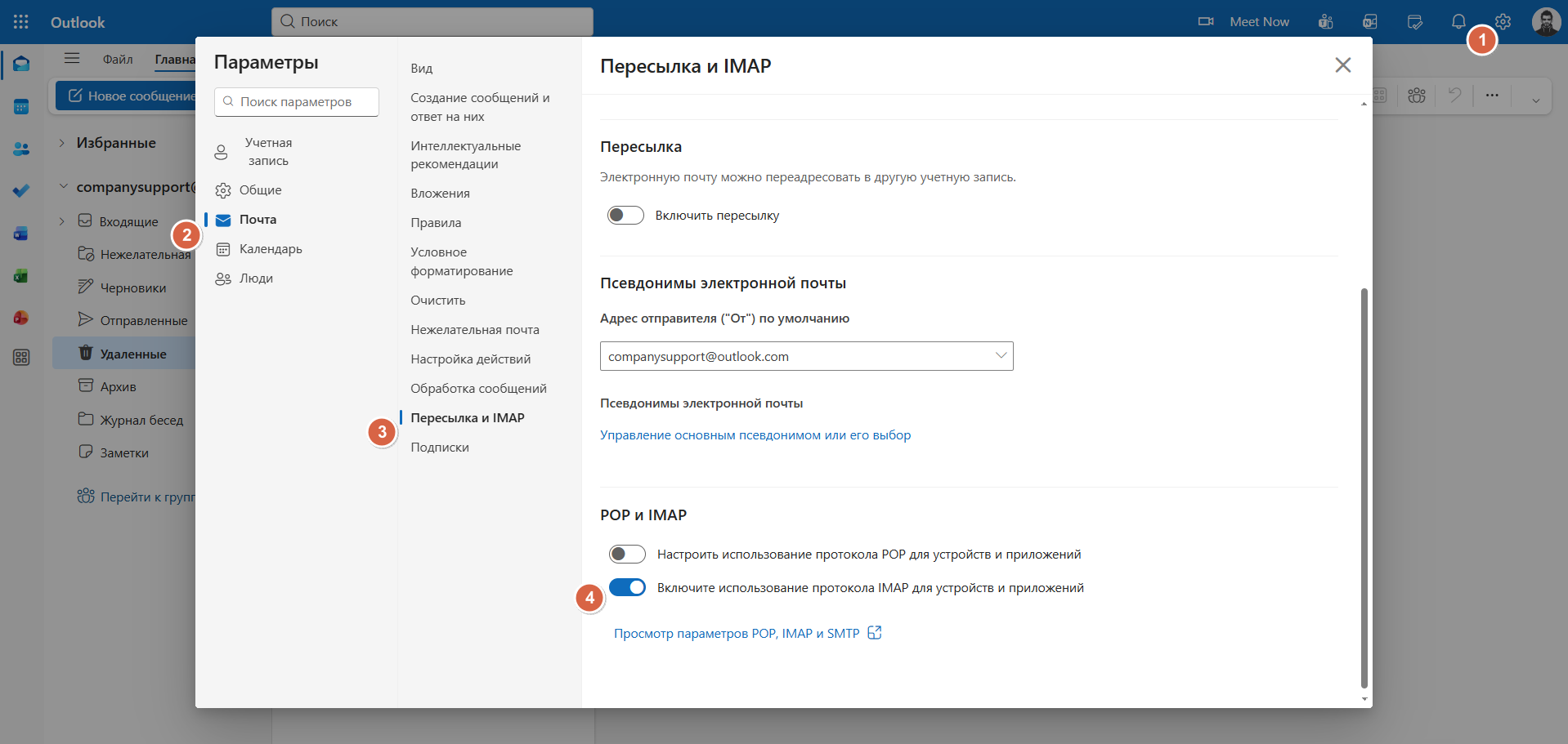 2. В настройках почтового ящика Microsoft включите доступ по IMAP. Сделать это можно по пути Параметры — Почта — Пересылка и IMAP — POP и IMAP.