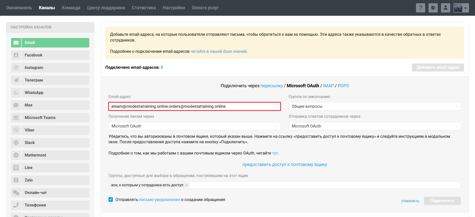 4. Подключите группу / список рассылки к Омнидеску, указав в качестве логина адрес вашей группы или списка рассылки и через двоеточие — адрес вашего реального корпоративного почтового ящика Exchange Online, который вы добавили как участника и владельца группы: