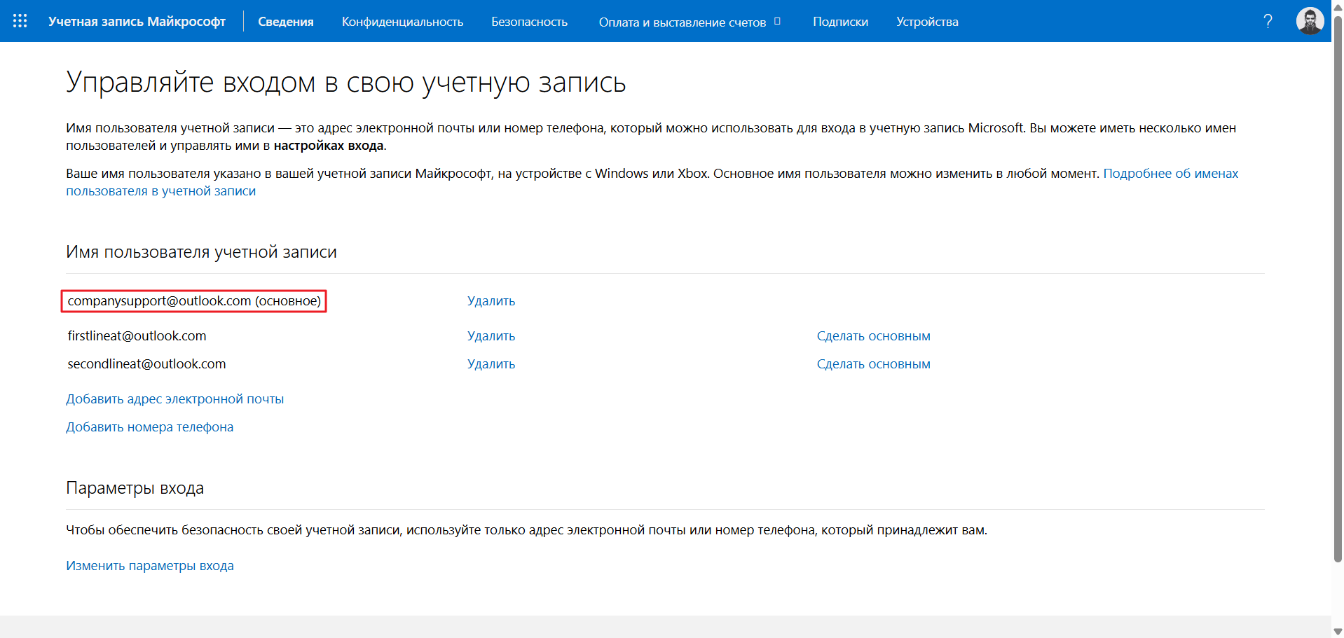 В личной учетной записи Microsoft можно создать несколько псевдонимов, которые выглядят как обычные email-адреса. Все они работают в рамках одной учетной записи и используют общий пароль.