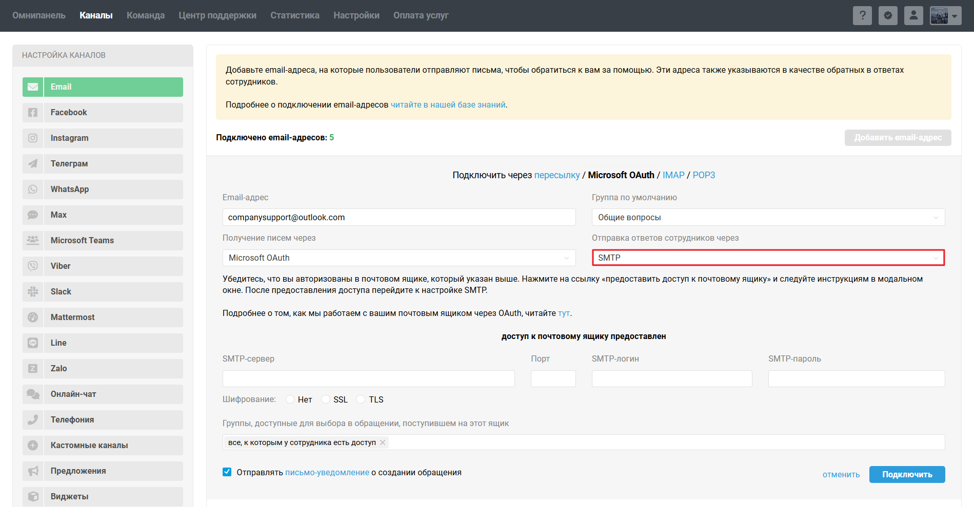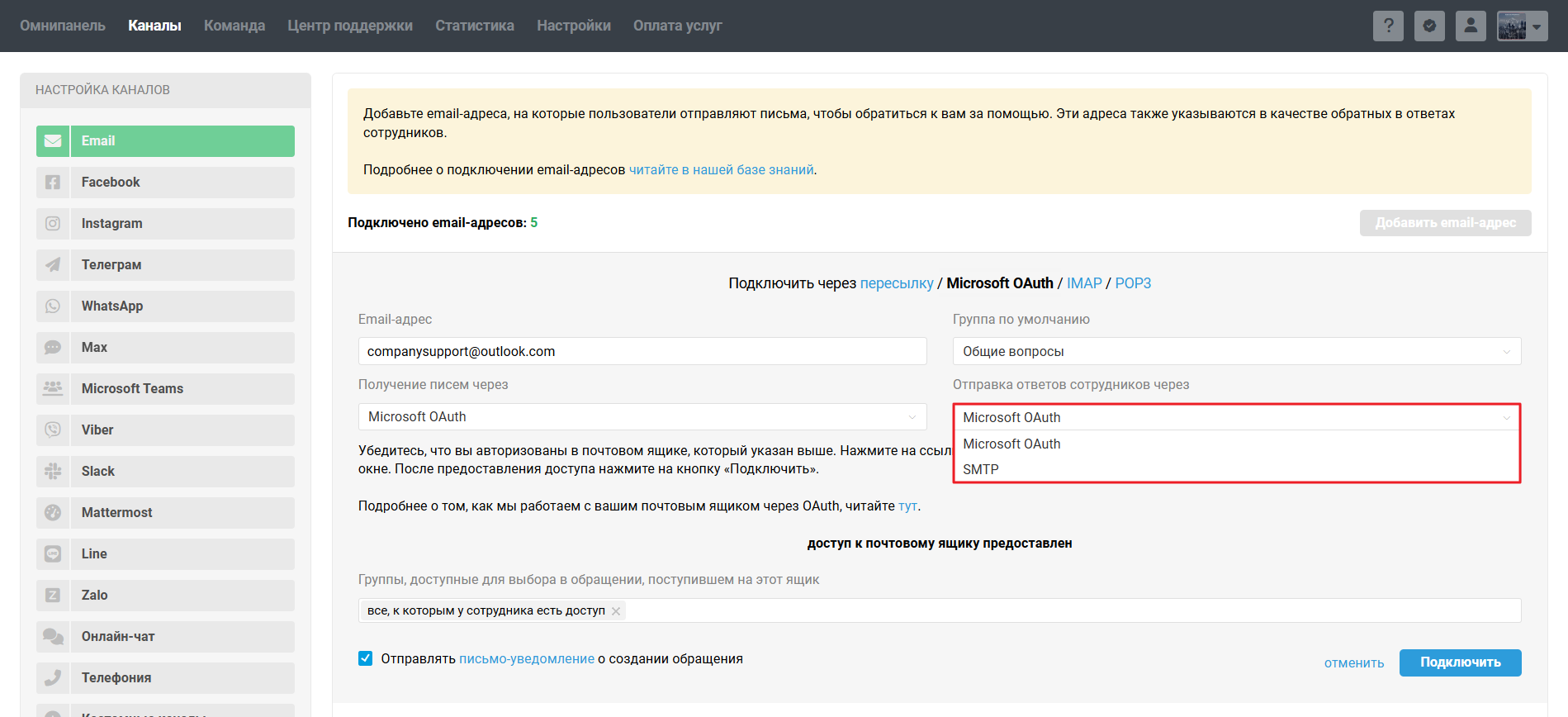 1. Перейдите в аккаунт администратора в Омнидеске в раздел Каналы → подраздел Email, нажмите «добавить email-адрес» → в опции «Подключить» выберите Microsoft OAuth.